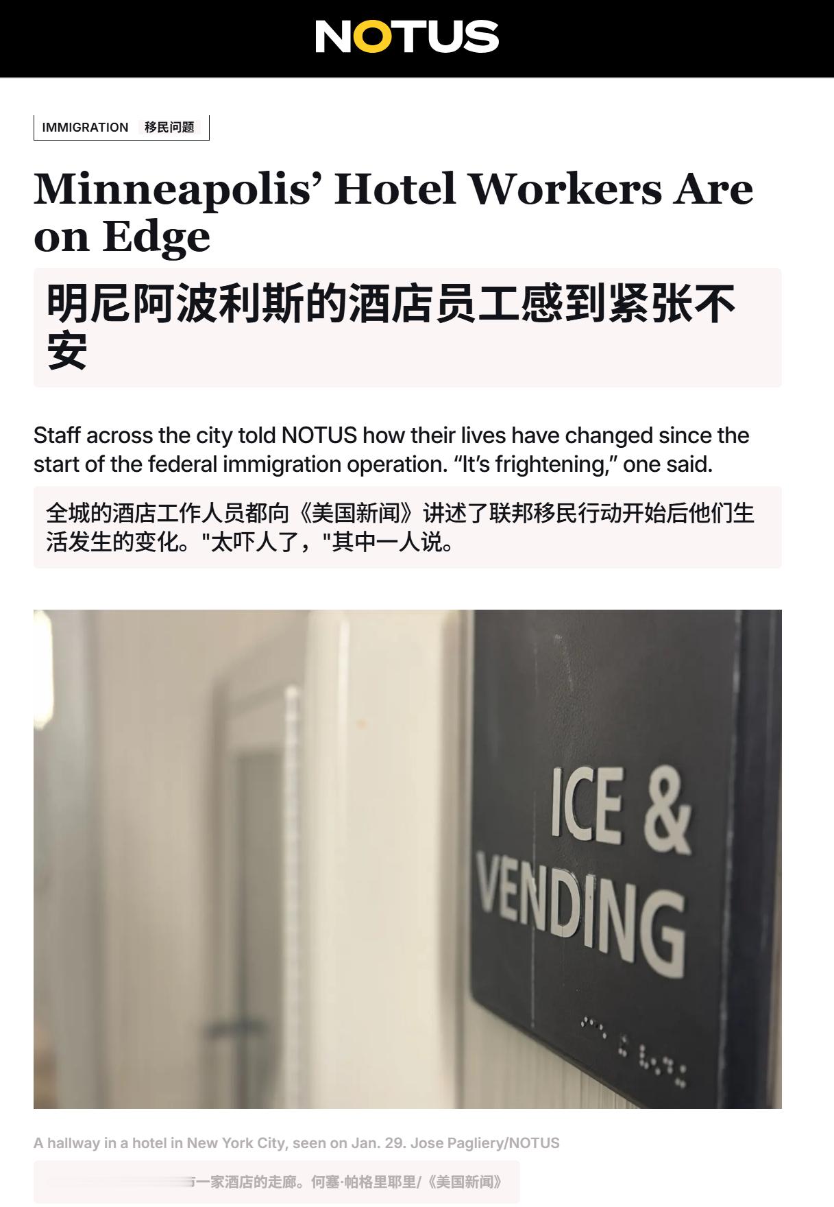 🔻NOTUS 新闻网本周走访了明尼阿波利斯市六家酒店,用西班牙语采访礼宾员与保洁人员,聆听那些夹在住客与抗议者间的从业者心声。所有受访者均表示,截至目前,入住酒店的联邦 ICE、CBP 探员尚能保持尊重态度——但每位受访者都坦言,当某些探员不可避免地询问'你是哪里人'时,他们仍会感到彻骨寒意。🔻“他们怎么会问这个?这不是闲聊,”另一位女士在另一处地点表示,她说她现在试图把所有住在她酒店的联邦探员都安排到楼上相邻的房间里,这样就不会吓到其他客人,也能尽量减少他们与工作人员的接触。🔻在第三家酒店,一位礼宾员告诉 NOTUS,去年 12 月联邦探员涌进这座城市时,一半的清洁工都不来上班了。为了保护剩下的三名客房服务员每天早上通勤时不被移民巡逻队拦下,酒店的维修技师主动承担起了拼车司机的工作。🔻另一位酒店员工说,她所在酒店的联邦探员全靠微波炉加热的坎贝尔鸡肉面条汤度日,因为他们很难找到愿意为他们服务的餐馆。热点现场海外新鲜事美国政府又停摆了