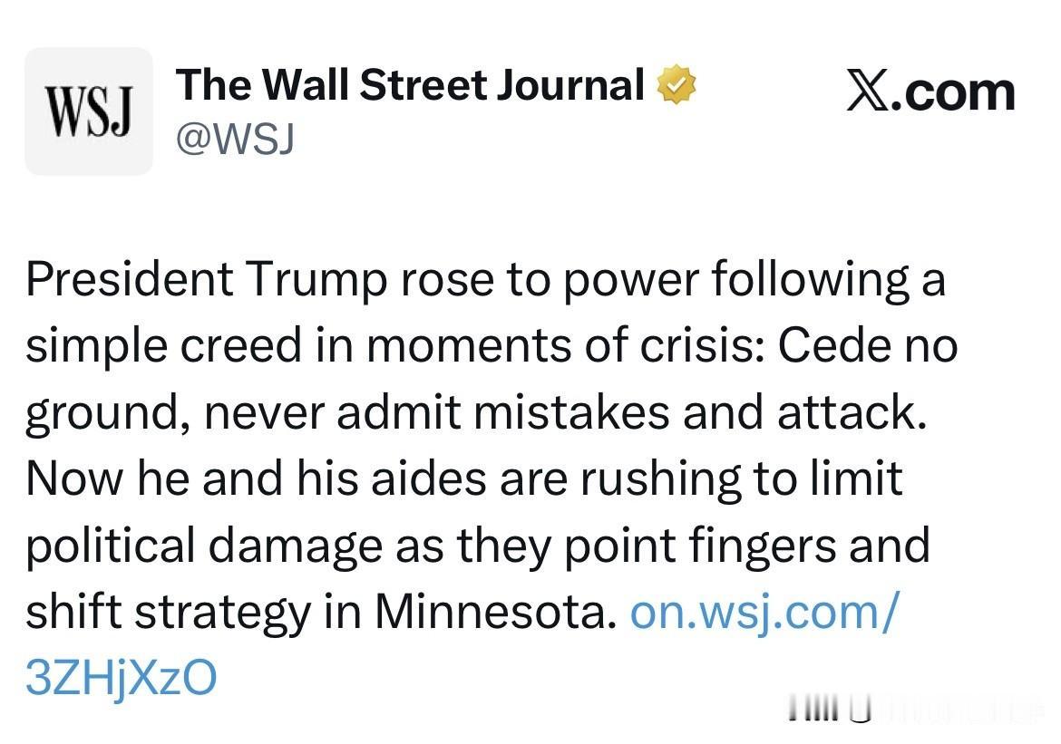 华尔街日报报道,特朗普总统凭借一条简单的危机应对信条崛起:绝不退让,绝不承认错误,全力进攻。 但是如今,他和他的助手们正忙于在明尼苏达州美国公民在执法过程中死亡事件而互相指责、调整策略,以尽可能减少政治损失。 移民执法局和边境巡逻队在明尼苏达州掀起如此激烈的对抗,并导致美国公民的死亡,这对于在美国进行的行政部门执法而言是灾难性的结果。如果总统不宣布承担责任,那他的手下就会分别各自主动或被动地担负起责任。
