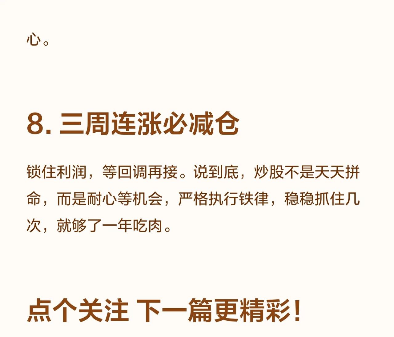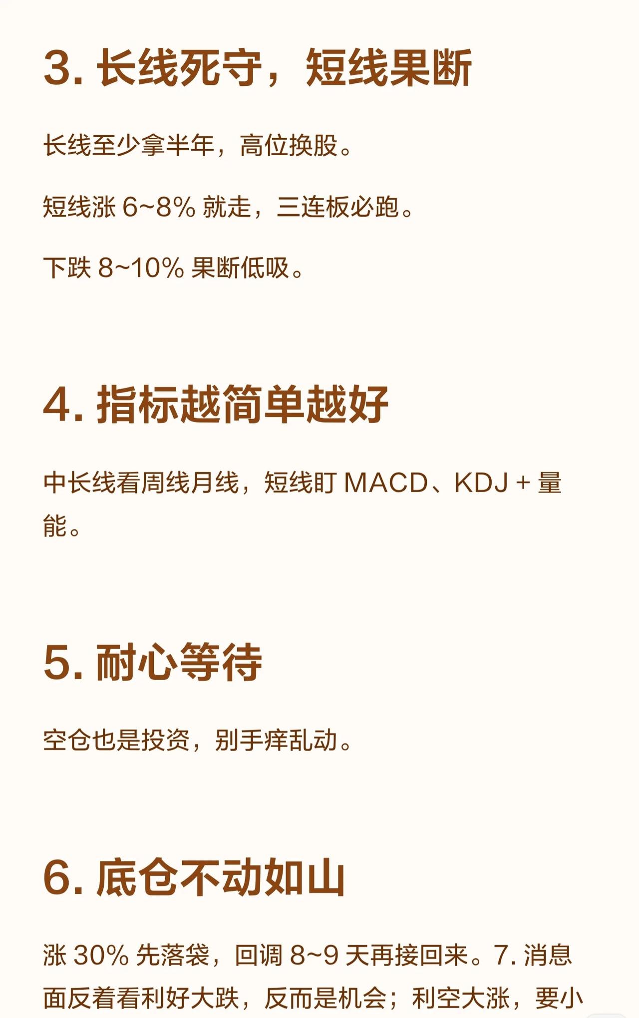一套股票投资“铁律”,核心在于纪律+集中+耐心+止盈: 选股纪律:只盯1~3只龙头股,不碰杂毛股,龙头才是主要利润来源。 仓位管理:资金一分为二——50%长线底仓跟主线逻辑,50%短线波段灵活进出。 长短线策略: 长线至少拿半年,高位换股; 短线涨6~8%就走,三连板必跑,跌8~10%果断低吸。 指标运用:中长线看周线、月线,短线盯MACD、KDJ+量能,越简单越好。 耐心等待:空仓也是投资,不手痒乱动。 底仓管理:底仓不动如山,涨30%先落袋,回调8~9天再接回。 消息面判断:利好大跌是机会,利空大涨要小心。 止盈策略:三周连涨必减仓,锁住利润等回调。 整体强调:炒股靠纪律而非频繁操作,集中优质标的,合理分配仓位,耐心等待机会,严格执行止盈止损,一年抓住几次关键行情即可获得稳定收益。