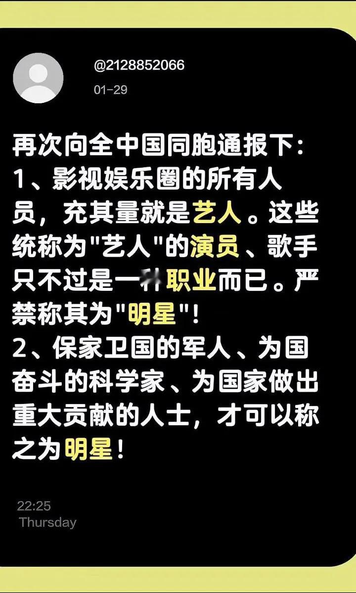 这哥们儿说我心坎里去了[赞] 必须为这个观点狠狠点赞!影视娱乐圈的演员、歌手,说到底只是一份职业,统称艺人就够了,真没必要捧上“明星”的神坛! 什么才配叫明星?是身披戎装保家卫国的军人,是隐姓埋名为国攻关的科学家,是在各个领域为国家拼出实绩、做出重大贡献的人!他们才是照亮时代的光,是值得全民追崇的真明星! 别让浮躁的流量模糊了认知,摆正定位,致敬那些真正担得起“明星”二字的国之脊梁!🇨🇳 演员行业 理智评价艺人