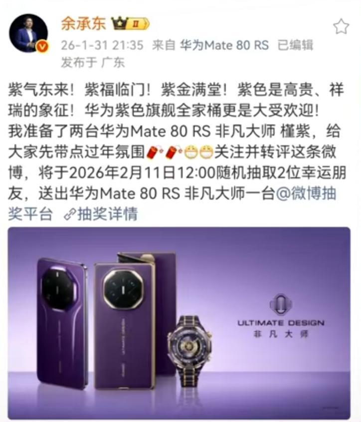 哇塞。余总又拿了两台mate80RS来抽奖了,还是紫色的哦。赶紧去余总那里留言,说不定中奖的就是你呢。