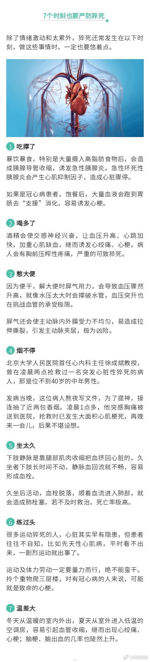 【#什么情况下容易猝死#】#憋大便或易引发猝死# 一项刊登在《中国急救医学》期刊、分析了5516例猝死者解剖数据的研究揭示:心源性猝死是猝死的首要原因,30-63岁是高发年龄段。除了情绪激动和太累外,猝死还常发生在以下时刻,做这些事情时,一定也要悠着点。