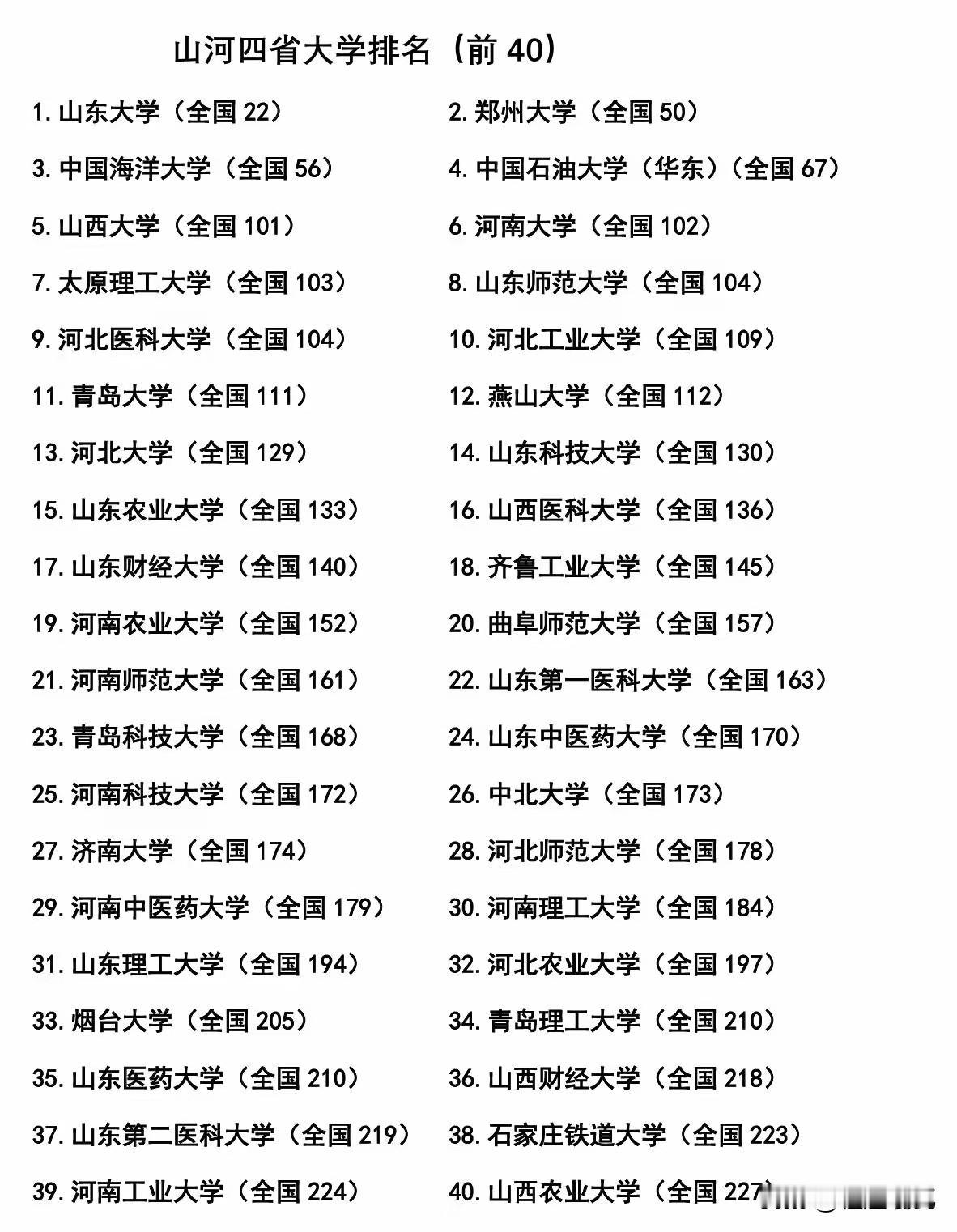 教育资源是时候向山河四省倾斜了! 看看山河四省的高校,985只有山东的山东大学和中国海洋大学两所,河南、山西、河北三省均没有985, 211高校,山东省有山东大学、中国海洋大学、中国石油大学三所,河南只有郑州大学;山西只有太原理工大学,河北只有河北工业大学却还在天津。 但是看看每年的考生,河南,山东几乎都是数量最多的,2025年,山河四省的考生人数达到300万人左右,而顶尖的大学或者是双一流高校,真的是少之又少。 这对于当地的考生来说,真的是太不友好了,什么时候能改变一下这个局面?