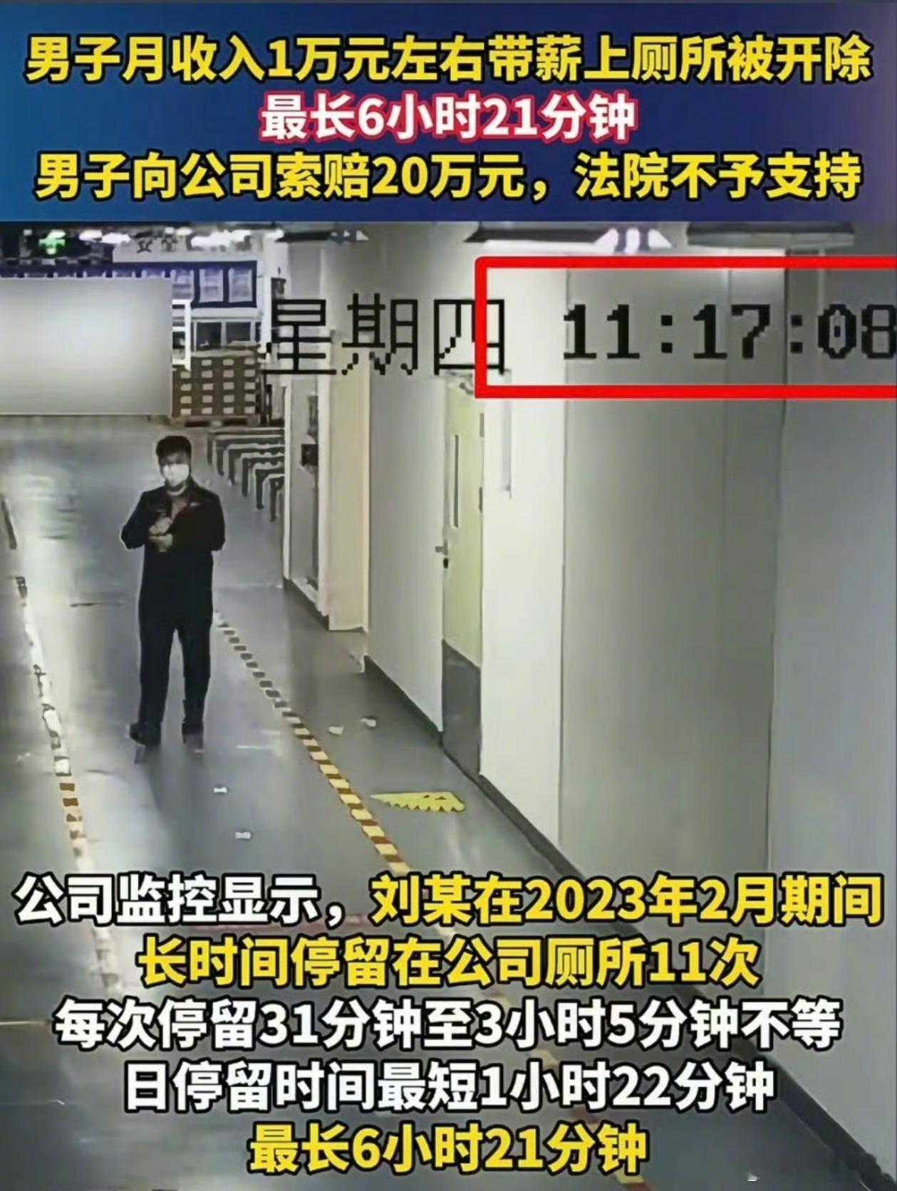 员工工作时间,因停留公司厕所时间过长,被开除。还想着过长能多长,不至于给人开除吧。结果……6小时21分钟。