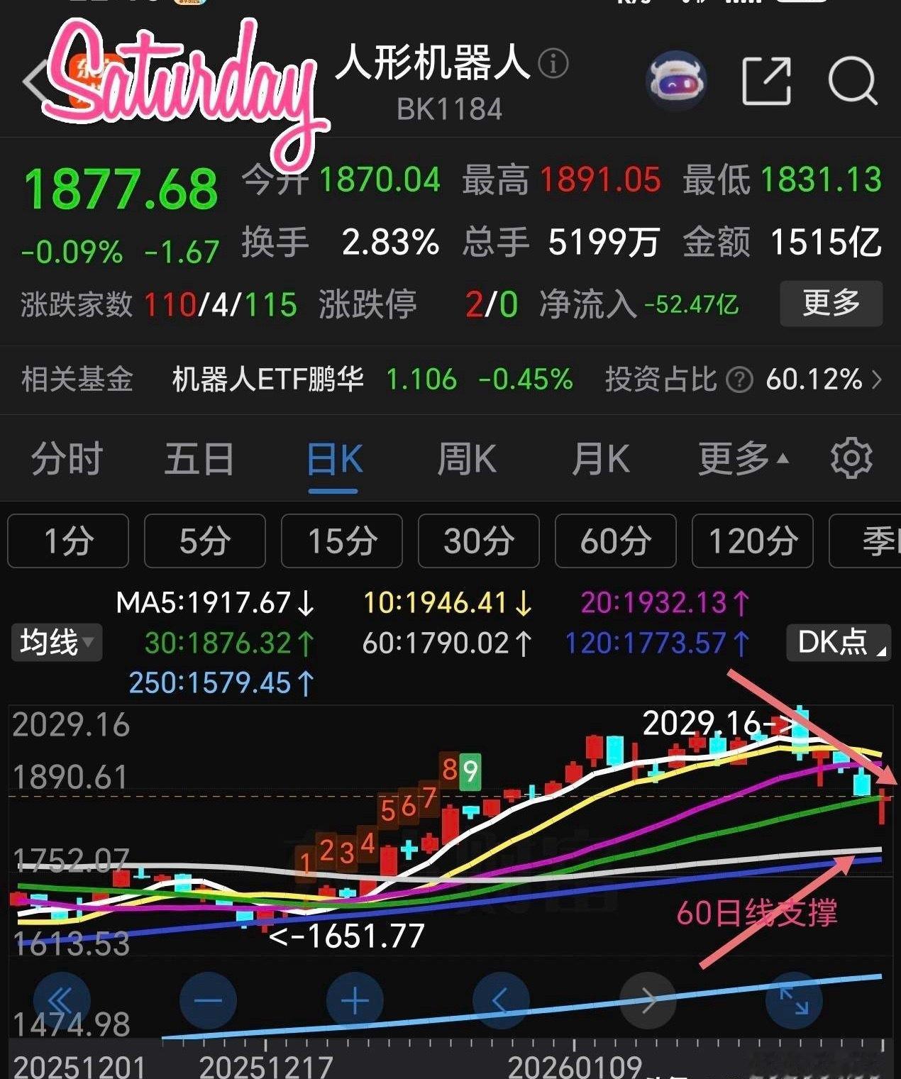 大家预期的机器人春节前会有一波反弹行情,不但没有看到上涨,反而提前下跌📉。但愿不是下跌10天反弹一两天!下图是人形机器人日线走势图,目前下跌趋势明显,5日线已经死差10日线,30日线支撑已经跌破,下周初不能有效站上30日线支撑,就要要回踩下方60日线支撑,大约还有5%下跌空间。可分期介入。周线已经跌破了5 周线支撑,收了个大阴棒,真是对它大失所望!接下来就是看主力挖多深的坑了。
