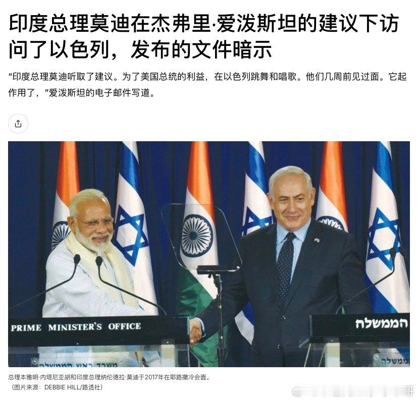 爱泼斯坦他当年在接受审判的时候,说莫迪听从他的建议访问以色列。印度大怒,说这是犯罪分子的胡诌。因为2017年莫迪访问以色列是为了纪念建交25周年,提前一年双方就策划了。海外新鲜事 而且莫迪不可能和爱泼斯坦有交集。众所周知他是禁欲主义者,和爱泼斯坦那种人完全是两极。
