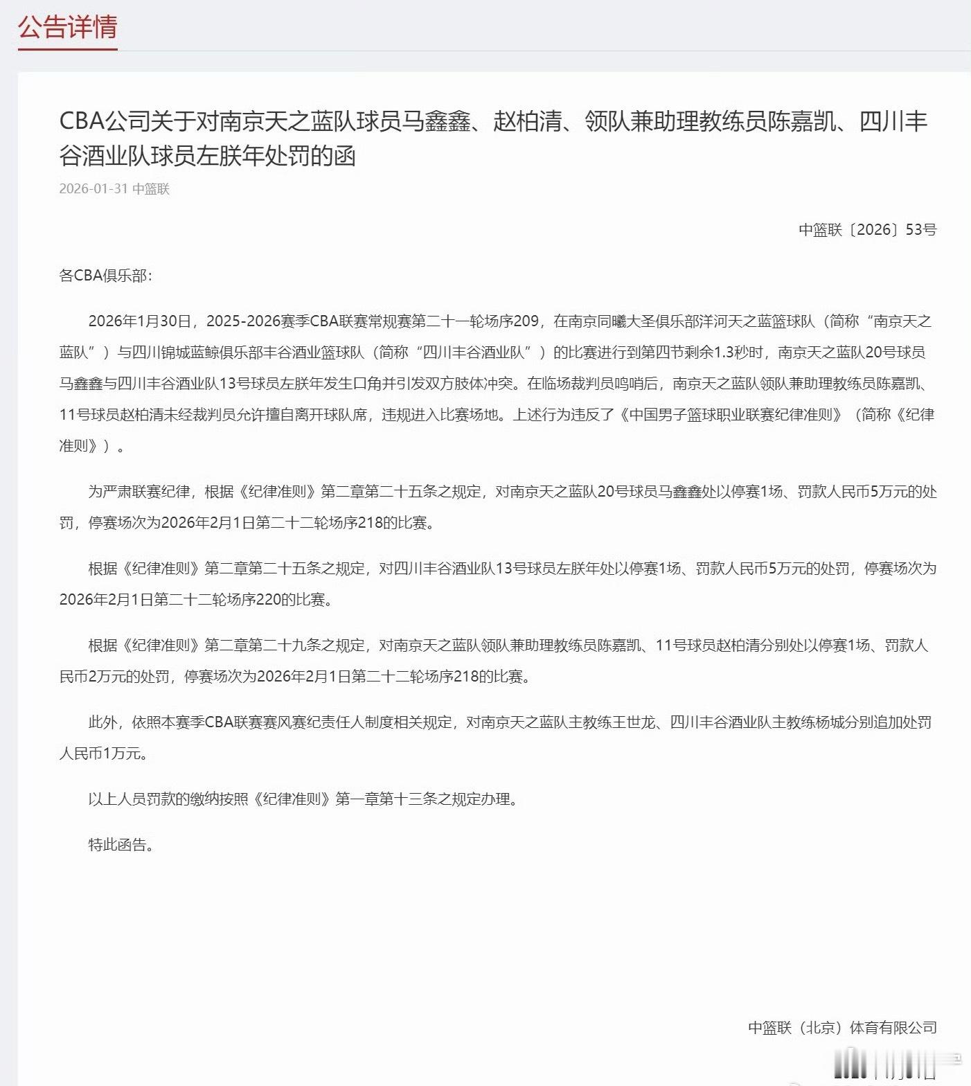 CBA官方对四川同曦赛场冲突三人被驱逐 一事开出罚单:马鑫鑫、左朕年分别停赛1场+罚款5万,赵柏清和同曦领队兼助教陈嘉凯均停赛1场+罚款2万。两队主教练均被罚款1万。