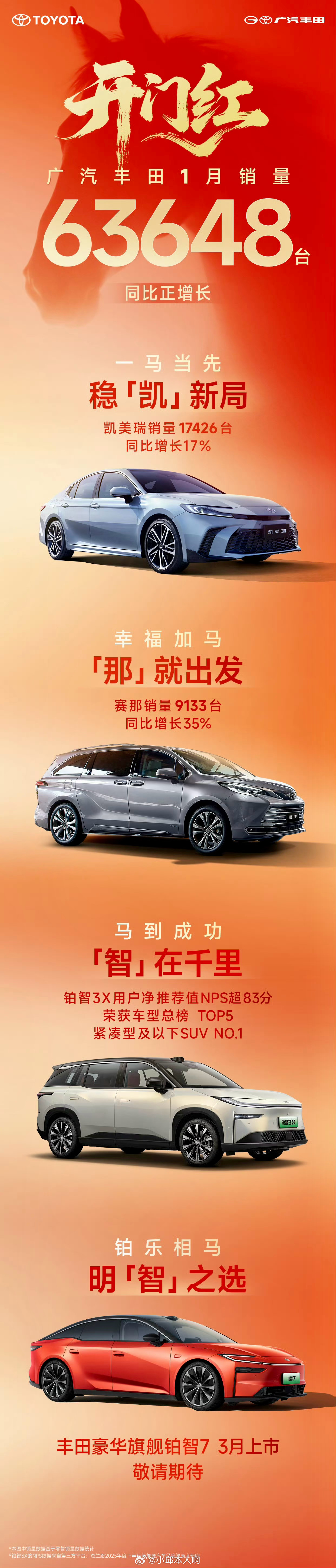 广汽丰田迎来2026年“开门红”!1月销量达63648台,实现同比正增长,稳中有进。更令人期待的是,品牌首款豪华纯电旗舰,铂智7将于3月正式上市,集鸿蒙座舱、双腔空悬、Momenta R6智驾、华为电驱于一身。广汽丰田1月销量63648台