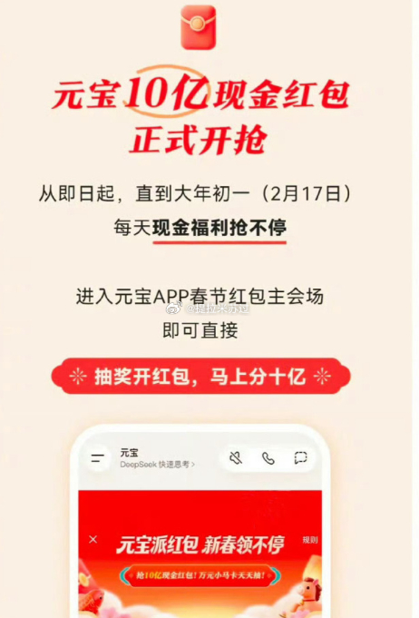 今天你抢了多少?✅ 活动主体:腾讯元宝App💰 奖励规模:10亿元现金,最高万元红包📆 活动时间:2月1日至2月17日🔗 传播方式:微信群、朋友圈、QQ等社交裂变🎯 目标:拉新获客,抢占AI应用心智