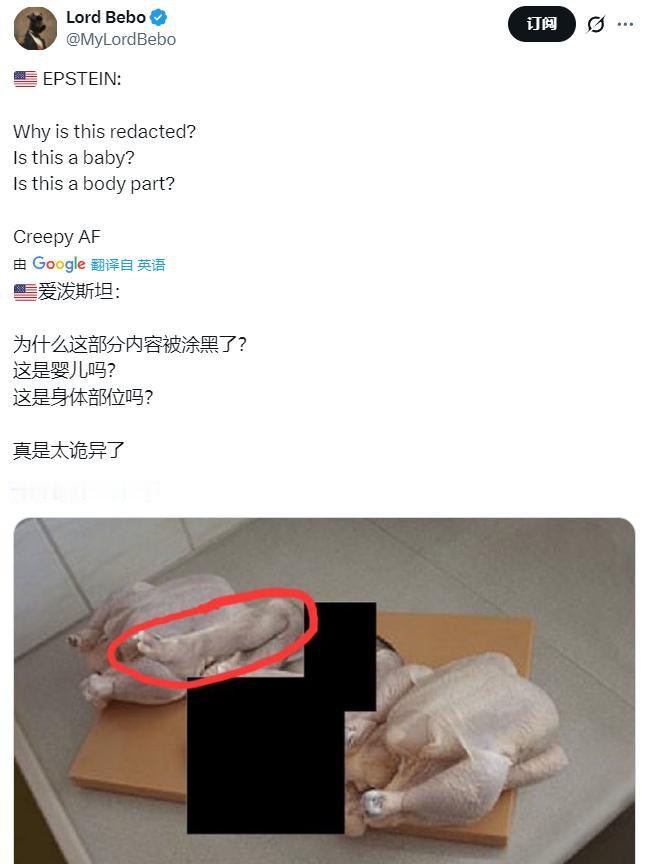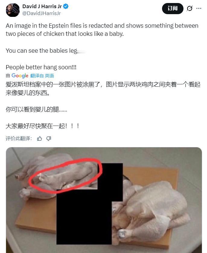 据多名X博主:爱泼斯坦档案中最令人不安的图片之一,是两块鸡肉中间的一张被涂黑的图片。如果这只是一块鸡肉,为什么这张图片要被涂黑呢? 刚刚查询了美国司法部的网站,确实公布了这张图片。 图片编号:EFTA01646032