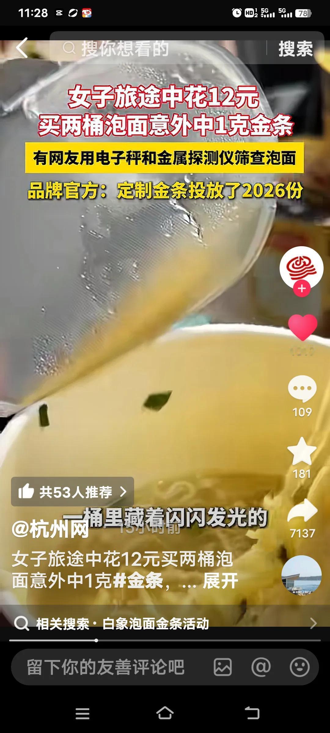 这可真是天上掉馅饼的美事!一位女子和闺蜜出游时,花12元买了两碗白象泡面。搅拌泡面时,感觉里面沉甸甸的,仔细一看,竟是一根1克的金条。这能不开心吗?能不惊喜吗?简直是做梦都想不到! 不少网友纷纷用秤去称白象泡面,白象官方回应称,此活动从2025年12月开始,到2026年3月才结束。这一消息曝光后,估计各个商品店进货时都得掂量掂量了。 马女士表示,等黄金涨价后卖掉,和闺蜜平分收益。这种好事谁能不心动呢?真是太让人开心啦! 黄金泡面 白象猪骨面 白象炒面 白象酸辣面 白象排骨 白象大股面