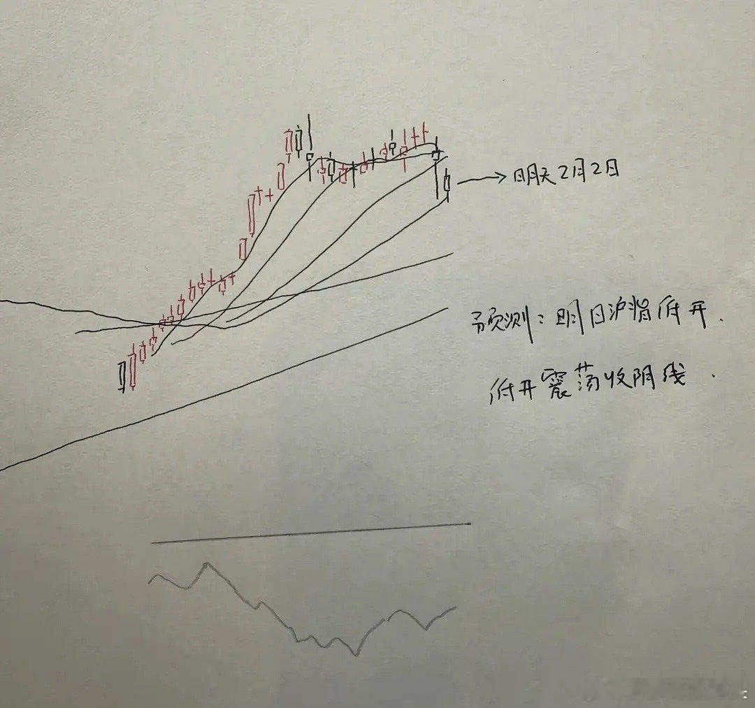 所以综合以上分析,对于明天市场的走势,是,短线我维持调整的判断。那么明天A股到底怎么走?大家请看图二关于明天走势的手绘预测图: