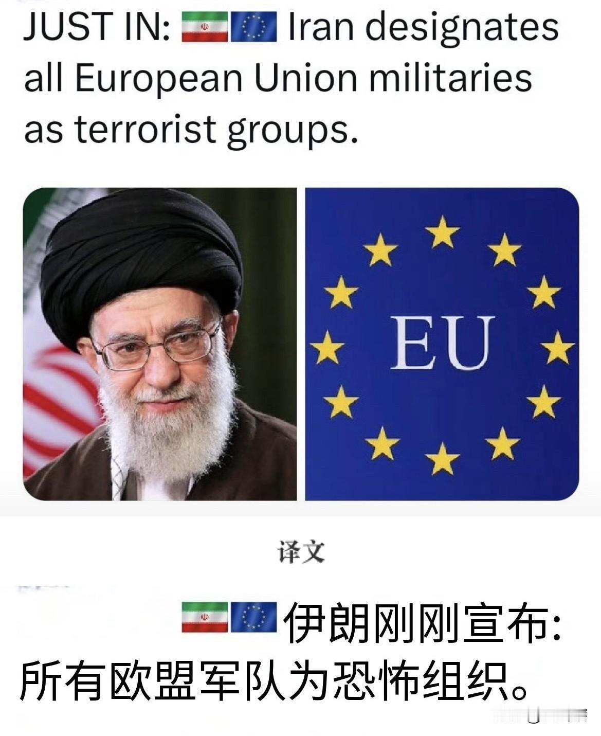重磅反击,伊朗宣布欧盟武装力量是‘’恐怖组织‘’! 据外媒消息,作为对欧盟把伊朗革命卫队认定为‘’恐怖组织‘’的回应,伊朗给予了同等反击,伊斯兰议会议长卡利巴夫宣布将欧盟多国武装力量认定为‘’恐怖组织‘’。 卡利巴夫表示,一切行动后果将由欧盟自行承担。