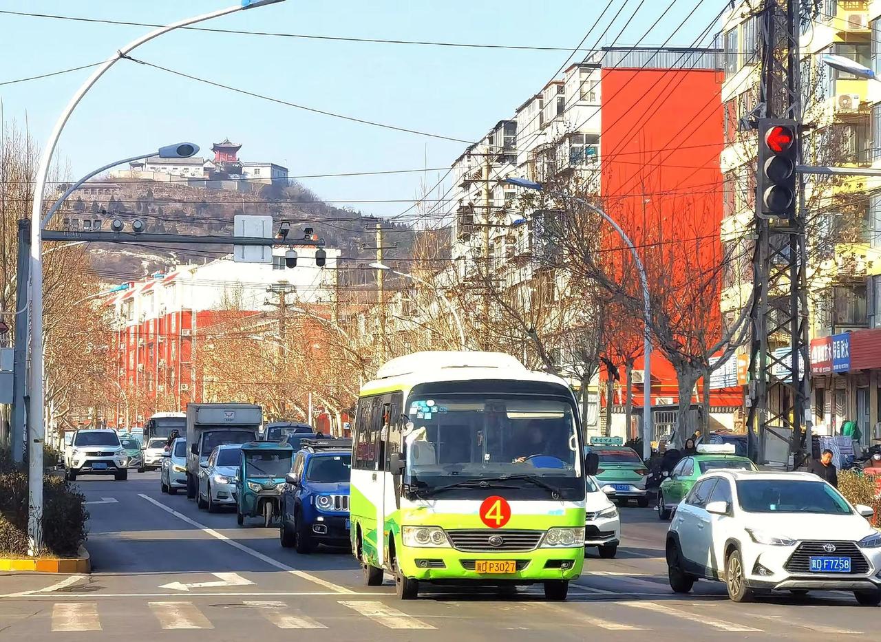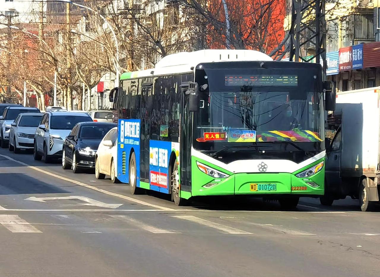 近日山东青岛,公交司机正驾驶着公交车在城市中穿行,到站后刚打开车门让乘客们上下车