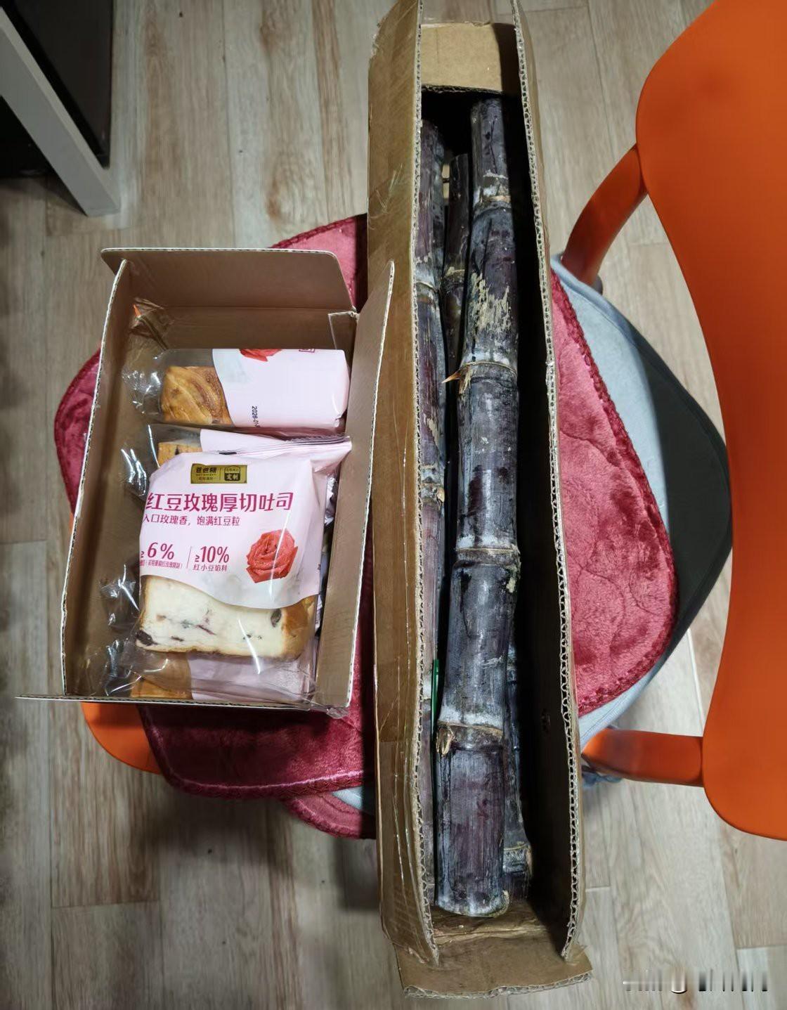 与辉同行定制红豆味吐司终于收到了,明早再吃,甘蔗把皮切掉再吃,挺费劲。 成都甘蔗很多,我家楼下好几份卖的,有10元一根,15元一根的,买过几次,水分很足。 但也想买广西甘蔗,因为董宇辉卖的,吃着味道就不一样,哈哈。 还有沃柑,明天能收到。