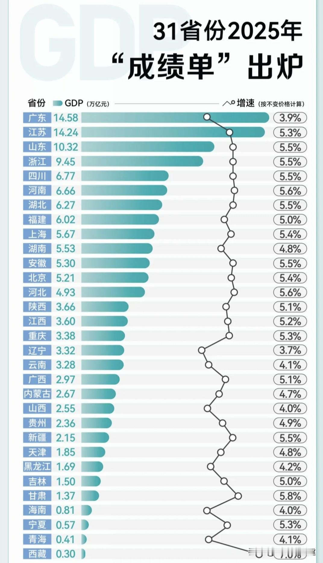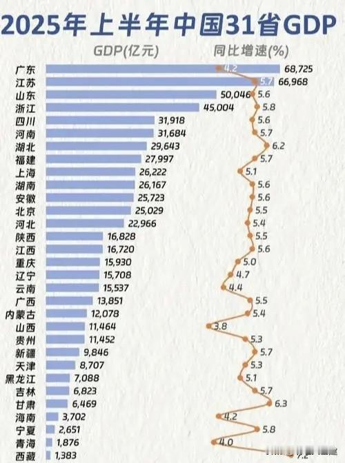 【全国31个省市自治区2025年GDP梳理,看看那几家进了10万亿俱乐部】 一、GDP总量分析(根据图片分析) 1、第一梯队3个(10万亿元以上) · 广东(14.58万亿)、江苏(14.24万亿),山东(10.32亿元)经济规模遥遥领先,为全国经济三核。 2、第二梯队9个(5–10万亿元) 浙江(9.45万亿),四川(6.77万亿)、河南(6.66万亿)、湖北(6.27万亿)、福建(6.02万亿)、上海(5.67万亿)、湖南(5.53万亿)、安徽(5.30万亿)、北京(5.21万亿),第二梯队都为经济大省,产业体系完整,增速稳定。 3、第三梯队16个(1–5万亿元) ·河北(4.93万亿)、 陕西(3.66万亿)、江西(3.60万亿)、重庆(3.38万亿)、辽宁(3.32万亿)、云南(3.28万亿)、广西(2.97万亿)、 内蒙古(2.67万亿)、山西(2.55万亿)、贵州(2.36万亿)、新疆(2.15万亿)、天津(1.85万亿)、黑龙江(1.69万亿)、吉林(1.50万亿)、甘肃(1.37万亿)、海南(0.81万亿) 多为中西部、东北或资源型省份,部分增速较快(如新疆5.5%、甘肃5.8%)。 4、第四梯队3个(低于1万亿元) 宁夏(0.57万亿)、青海(0.41万亿)、西藏(0.30万亿) 经济体量小,但增速较快(如西藏7.0%)。 二、人均GDP特征(需结合人口数据推算,此处为推断) 1、“人少钱多”型(人均GDP高)……上海、北京、江苏、浙江、福建都是经济发达,产业结构高端,人均收入领先。 …… 资源型或人口较少省份:内蒙古、陕西(能源)、宁夏(特色产业), 人均GDP相对较高。 2、“人多钱少”型(人均GDP较低)…… 河南、四川、湖南、广西、云南、甘肃,人口基数大,人均GDP相对偏低,发展压力较大。 ……东北三省(辽宁、吉林、黑龙江),人均GDP中等,但增速偏低,转型压力明显。 三、区域发展特征 1、东部沿海地区……增速稳健(5.0%-5.5%),产业结构优化,创新驱动明显。 2、中部地区……增速较快(5.5%左右),承接产业转移,工业化进程加速。 湖北、安徽、河南表现突出,湖南、江西稳步增长。 3、西部地区……西藏(7.0%)、甘肃(5.8%)、新疆(5.5%)增速领先;广西、云南、贵州增速中等,但人均偏低; 4、东北地区……增速整体偏低(3.7%-5.0%),经济转型压力大。 辽宁(3.7%)增速最慢,吉林、黑龙江略好但仍在低位。 5、特殊经济区 · 海南(4.0%):自贸港建设推进中,增速尚在爬坡。 · 天津(4.8%):增速温和,经济结构调整中。 四、核心总结 1. 区域差异: · 东部沿海仍为经济压舱石; · 中部崛起态势明显; · 西部增速快但人均偏低; · 东北振兴仍待突破。 4. 发展类型: · “人少钱多”型:多为沿海发达省市或资源型省份; · “人多钱少”型:集中在中西部人口大省。