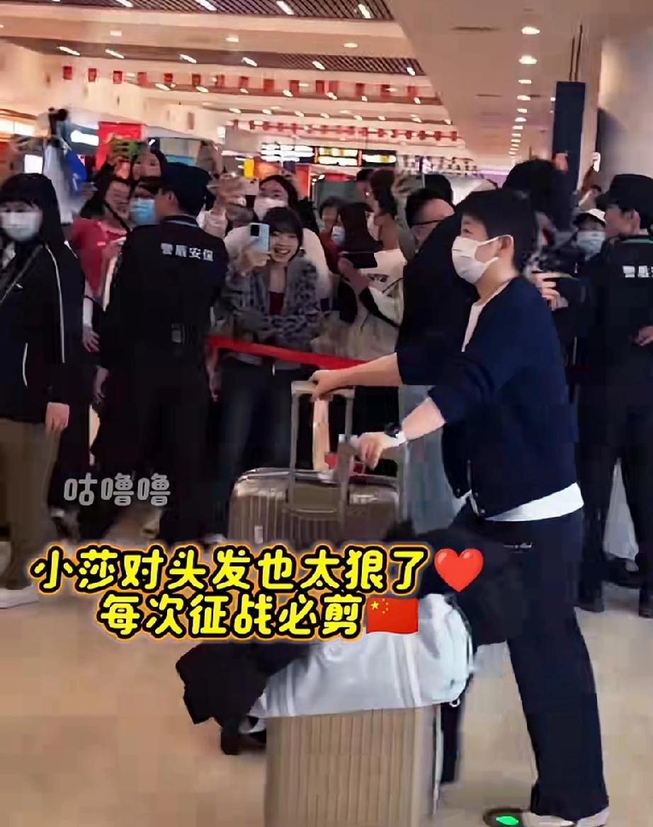所谓一切从头开始,莎莎就是最好的践行者。 这次莎莎出征海南,最明显的利落短发又剪了。 这次莎莎穿的不是运动装了,有点小香风的感觉,直筒裤,蓝色毛衣上衣。走路带风。推着标志的密码箱。估计回去要带很多海南美食回去哦。