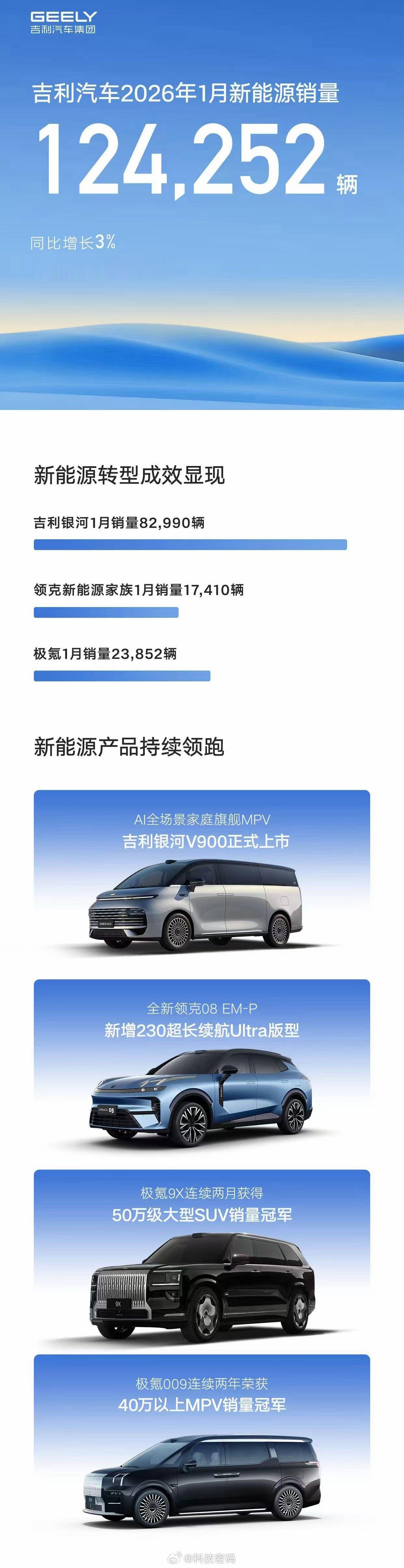 吉利汽车1月销量27万辆同环比双增长,新能源销量12.4万辆,海外出口销量同比翻倍增长!