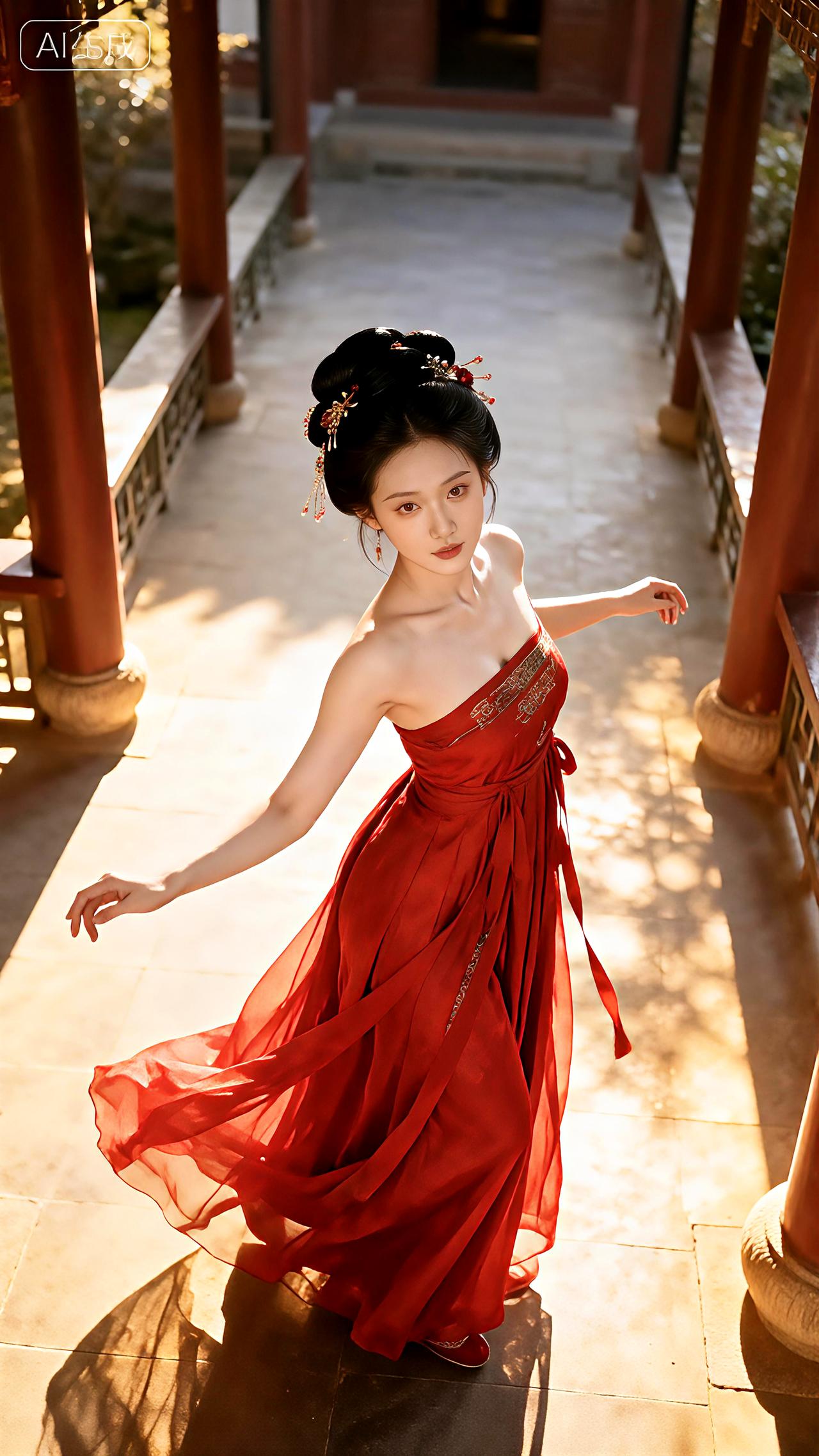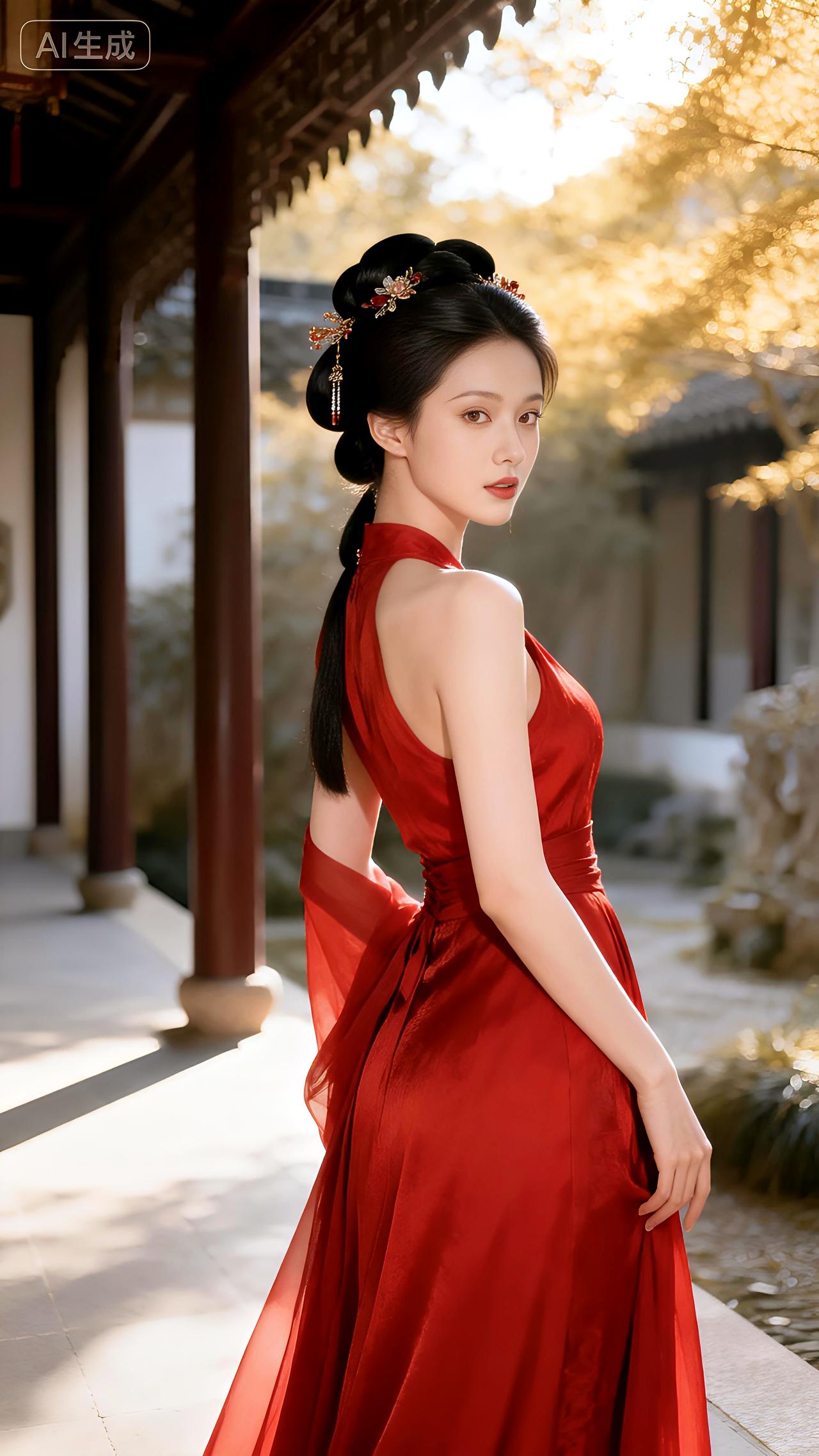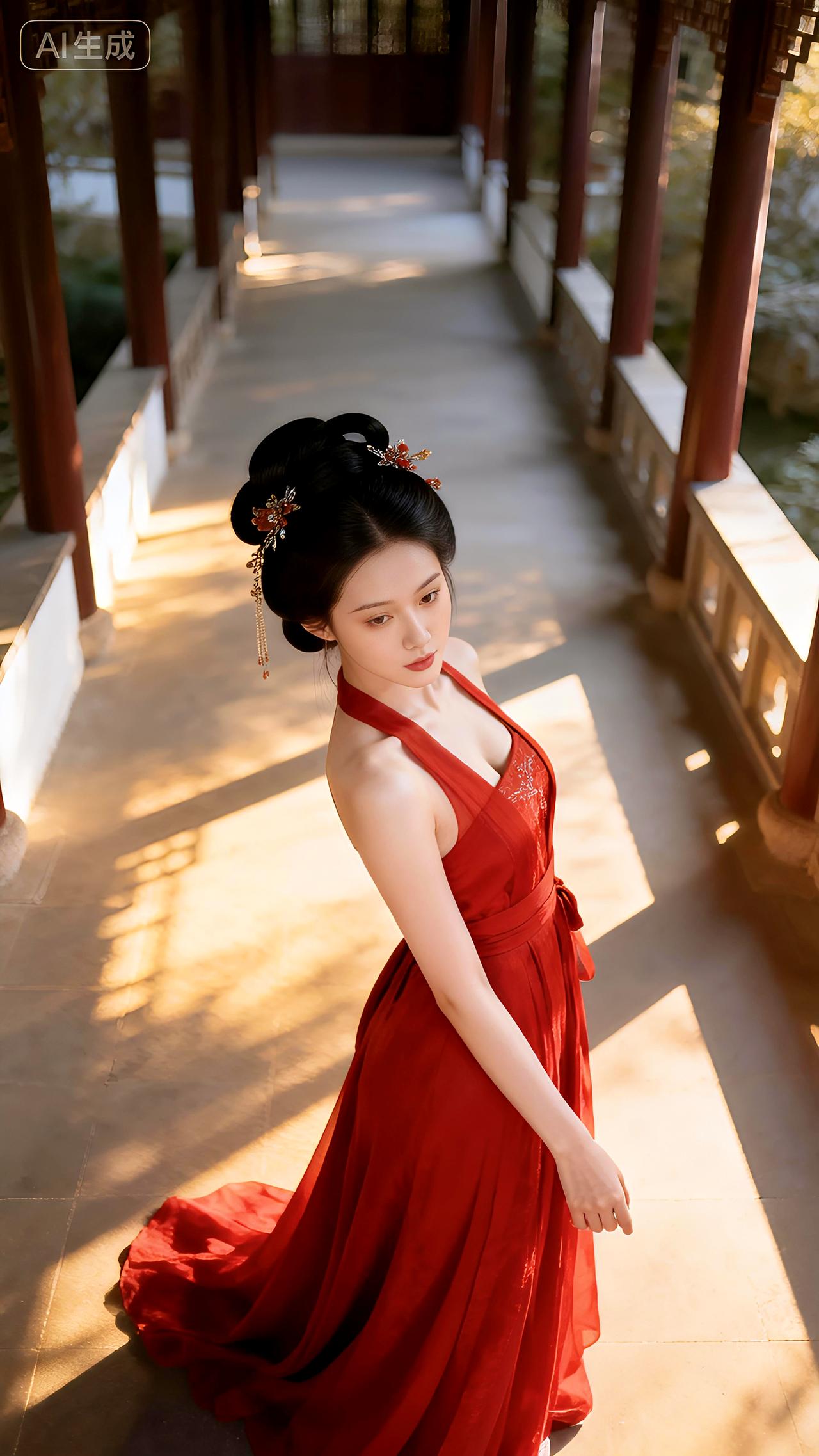 庭院回廊着汉装,红裳衬得玉肌香。豆包壁纸