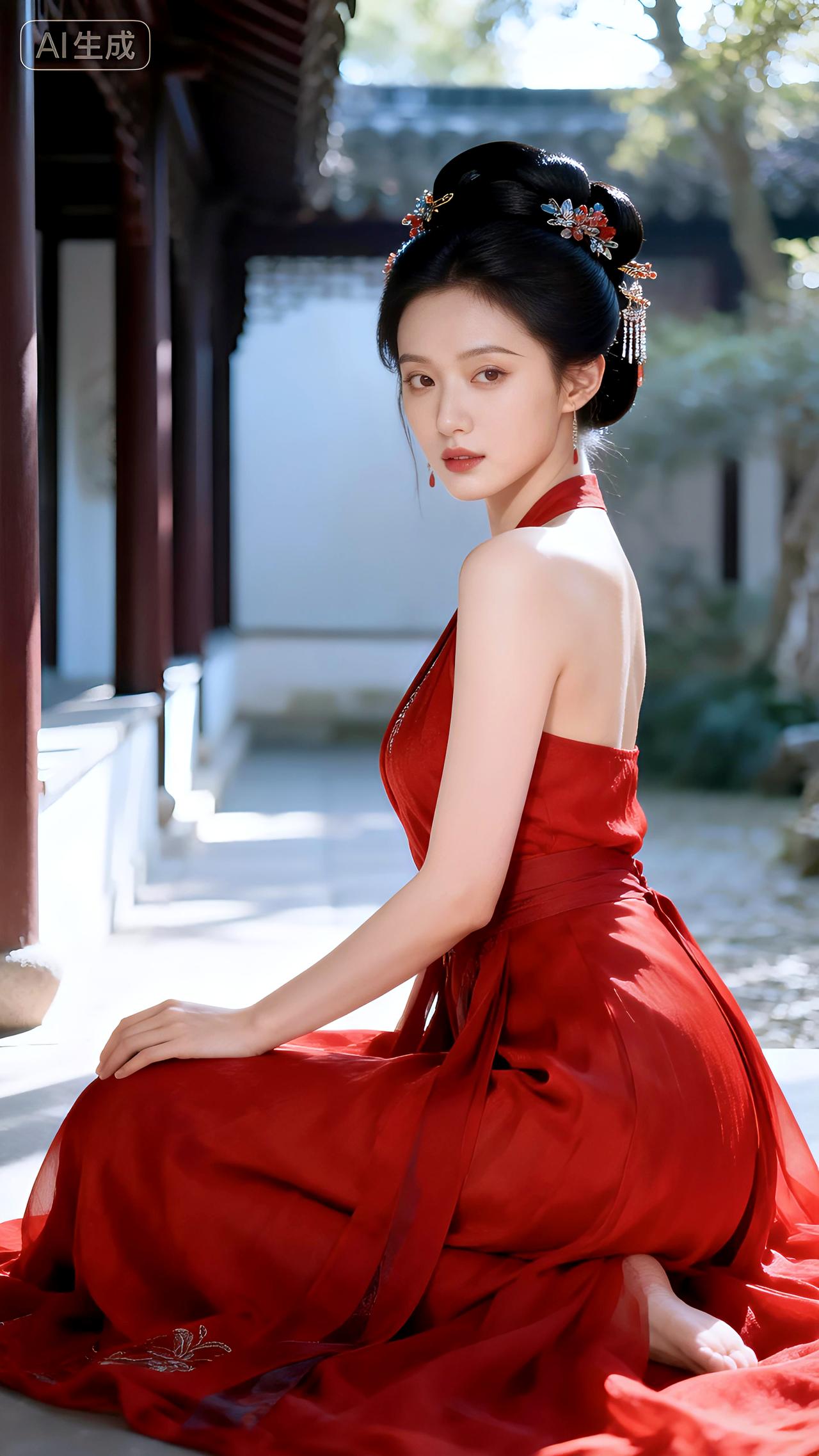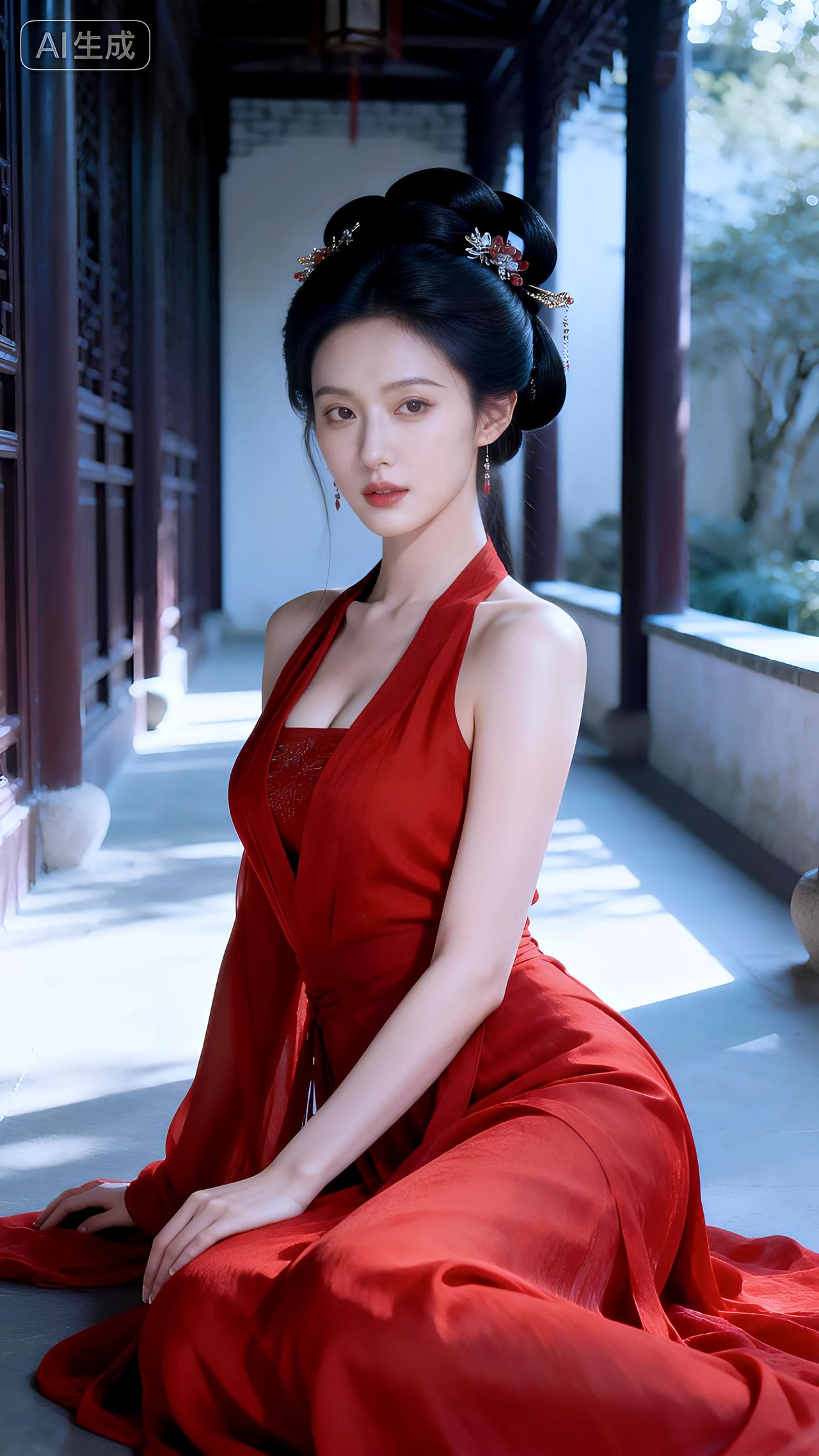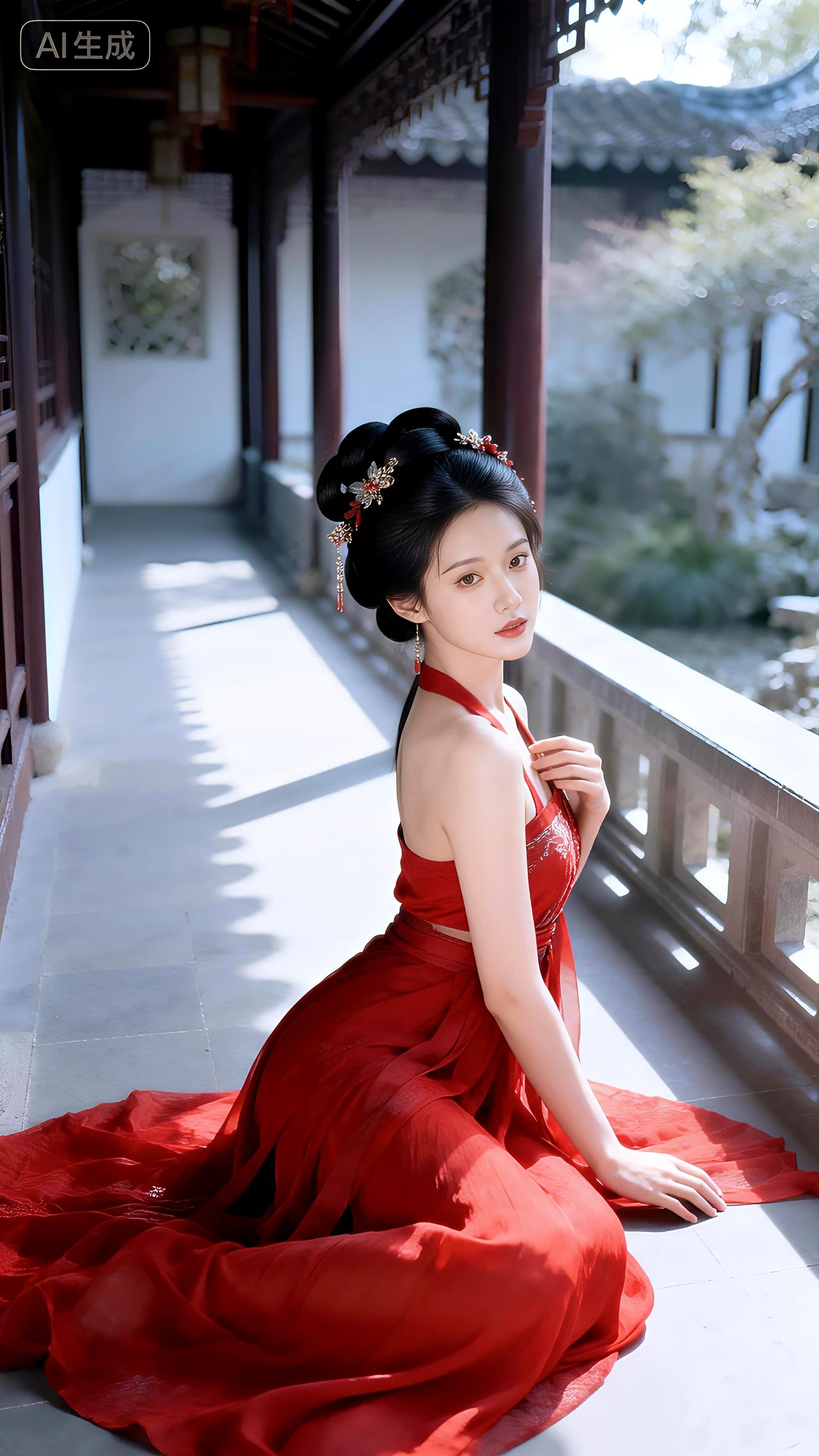 庭院回廊着汉装,红裳衬得玉肌香。豆包 壁纸