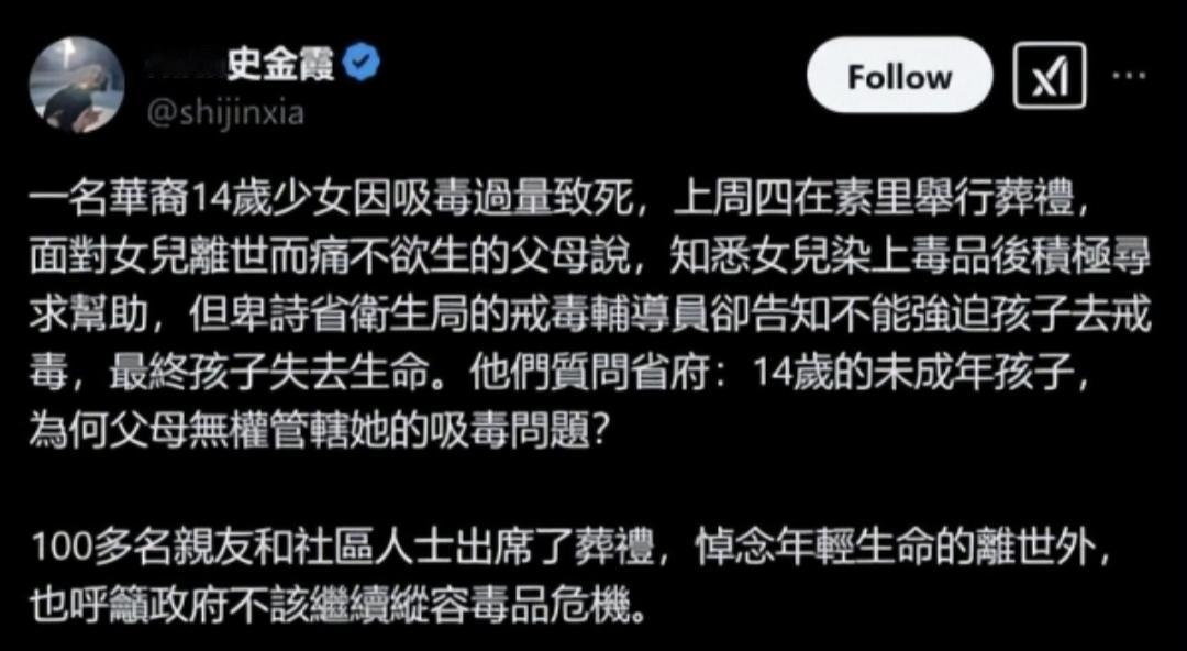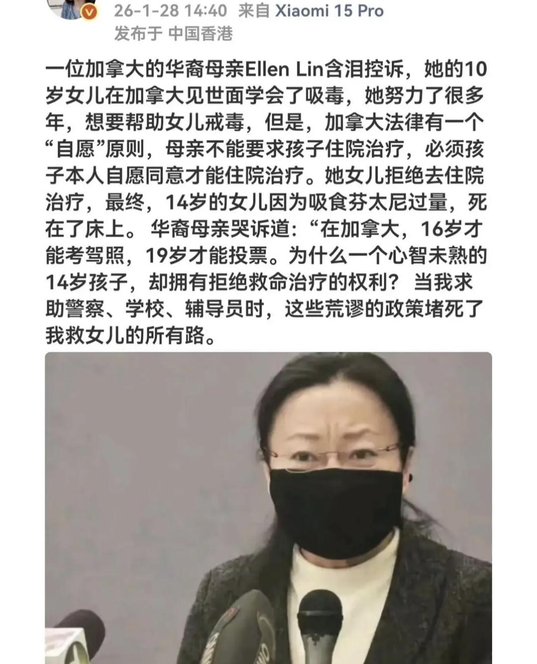 一位加拿大华裔母亲控诉,她14岁的女儿因为吸入过量的芬太尼去世了。 据说她女儿才十岁就学会吸毒,她想了很多办法帮女儿戒毒,但是因为加拿大法律的缘故,她不能强制要求她女儿去医院治疗。 她女儿拒绝去医院住院治疗,最终吸毒过量死在床上。 她所有帮助女儿的路都被堵死,只能眼睁睁的看着心智不成熟的女儿去世。