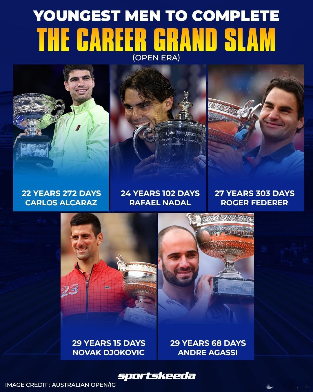 你这对年龄的算法有问题,费生于1981,在2009年完成全满贯,应该是28岁。纳1986-2010,24岁。德1987-2016,29岁。阿卡2003-2026,23岁