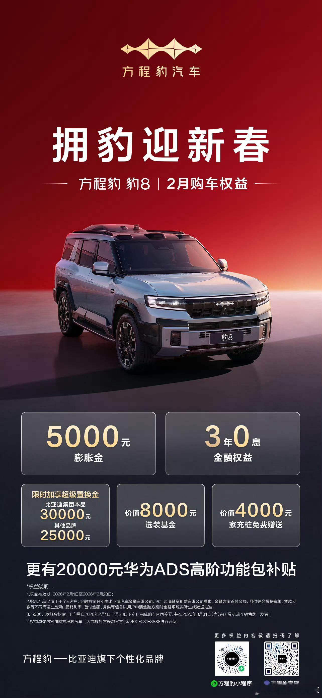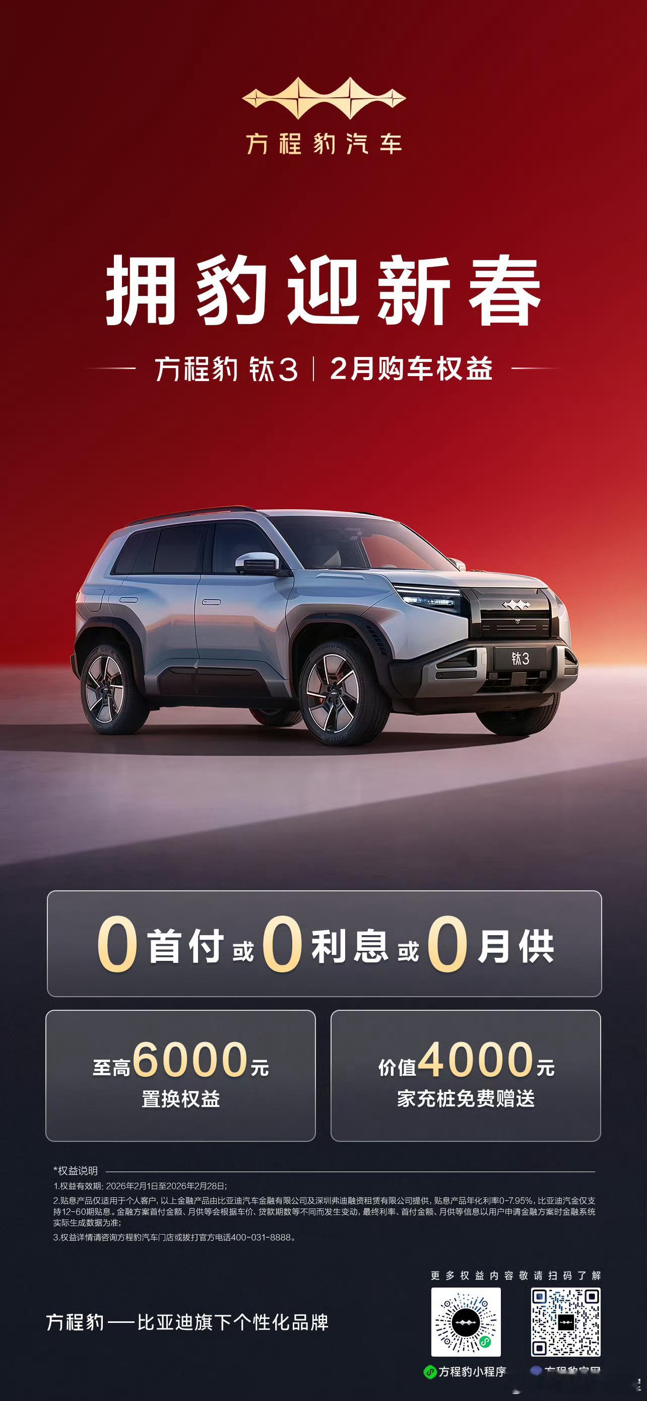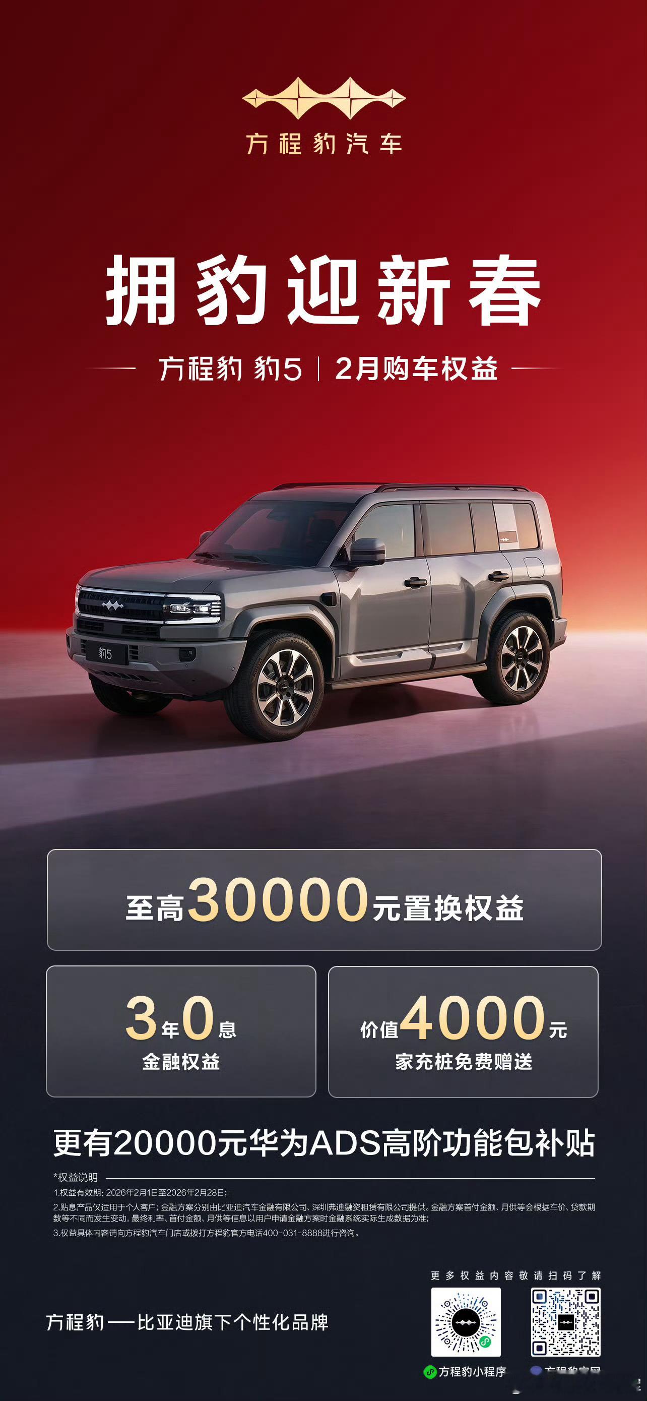 方程豹2月销售政策出来了,主要是免息政策,每款车权益都不一样,诚意满满! 大v聊车方程豹