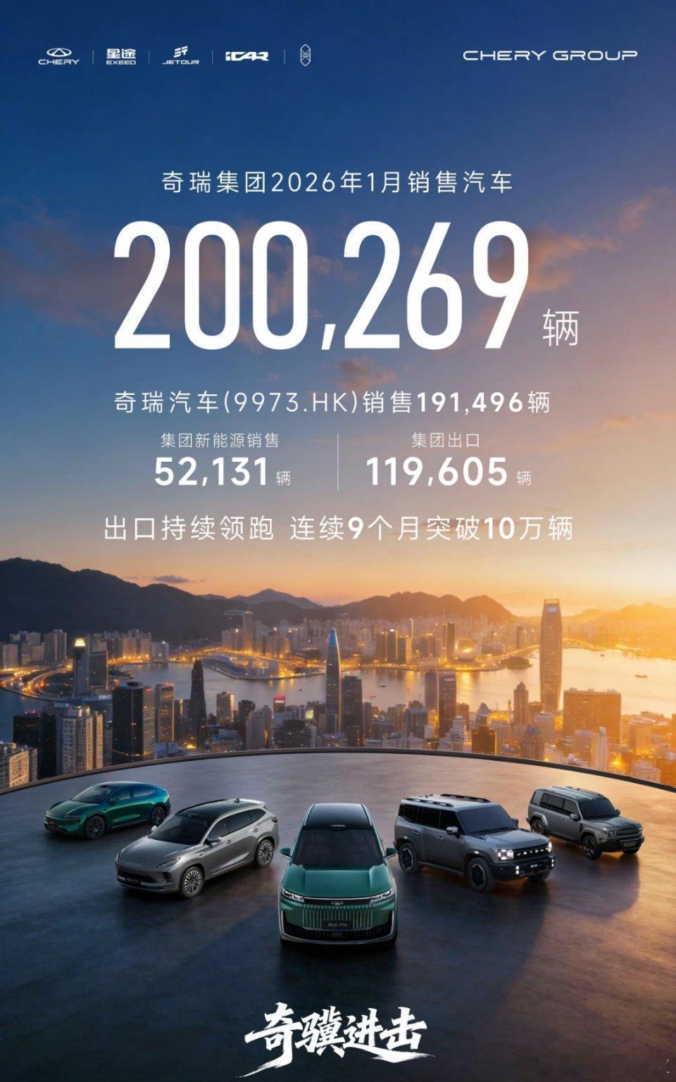 奇瑞:销售200269辆,其中出口11.96万辆,同比增长48.1%,连续9个月超10万辆,稳居中国汽车出口第一;