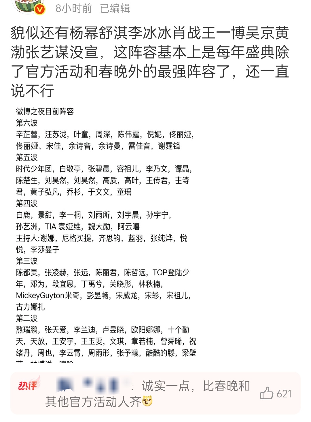 微博之夜第五波阵容官宣,陈楚生终于出现了!看看这五波阵容,好多人啊,从演员到歌