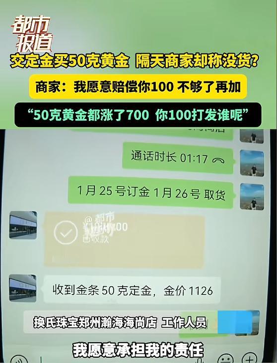 “玩不起别玩!”近日,河南郑州,一男子见金价上涨,就在直播间以每克1126元价格预定了50克金条,自己还交了1000定金,没想到第二天金价又涨了,男子去提货时,老板突然不卖了,只愿意赔偿男子100元,这把男子气坏了!网友:太没诚信了!   最近河南郑州出了个事儿,挺让人膈应的,跟买金条有关,说白了就是商家没诚信,玩不起还偏要玩。   郑州一名董先生(化名),看着最近金价一个劲往上走,就想着趁势预定点金条,说不定能小赚一笔。   他在一个网络直播间里,看中了一款金条,和老板谈好每克1126元,一共订了50克,当场就交了1000元定金,双方就这么说好,等董先生第二天去实体店提货,再付尾款。   董先生本来也就是想着跟着行情走,没指望能赚多大钱,可没想到,就过了一晚上,金价又涨了,一克涨到了1140元。   这么一算,50克金条,光差价就有700元,相当于睡一觉就多了一笔额外收入,董先生自然高兴,第二天一早就兴冲冲地赶到老板的店里,准备提货。   可到了店里,老板的态度却来了个大转弯,压根不提提货的事,直接跟董先生说不卖了。   董先生一下子就懵了,明明前一天说好了,定金也交了,怎么说变卦就变卦。   追问之下,老板的理由也是来回换,一会说金柜钥匙在老婆那儿,拿不到金条,一会又说上游供货商没发货,自己也没货可交,总之就是一句话,金条没法交。   董先生越听越气,更让他不能接受的是,老板给出的解决方案,居然是退还他交的1000元定金,再额外赔偿100元,就让这事翻篇。   这100元,别说弥补差价损失了,就连董先生来回的车费都不够,也难怪董先生会气坏,换做谁遇到这种事,心里都得窝火。   老板这话一出,明眼人都能看出来,根本不是没货,就是看到金价涨了,觉得按之前谈好的价格卖,自己亏了,所以才故意毁约,想少赔点钱了事。   黄金价格有涨有跌,本来就是正常的商业风险,既然敢在直播间里接下订单,收下定金,就该想到后续可能出现的行情变化,哪能因为自己亏了,就不管之前的约定,反悔不认账。   懂点规矩的都知道,交了定金就相当于定死了这笔买卖,不管后面价格怎么波动,双方都得履约。   要是买家反悔,定金就拿不回来了;可要是卖家反悔,本来就该双倍返还定金,也就是董先生本该拿回2000元。   最后这事经过协商,老板同意多赔点,一共退给董先生1500元,董先生权衡再三,也只能接受,毕竟真要打官司,费时又费力,得不偿失。   这事传开后,不少网友都吐槽老板太没诚信。   其实仔细想想,老板看似省了几百块钱,实则丢了最宝贵的信誉。   做买卖,诚信才是立身之本,一次失信,可能就会失去一大批客户,以后再想做好生意,就难了。   而对于消费者来说,在直播间买金条这种贵重物品,一定要留好直播录屏、转账凭证这些证据,分清定金和订金的区别,避免遇到这种糟心事。   毕竟每个人看问题的角度不一样,对此你有什么不同的看法,可以在评论区留言讨论!!!