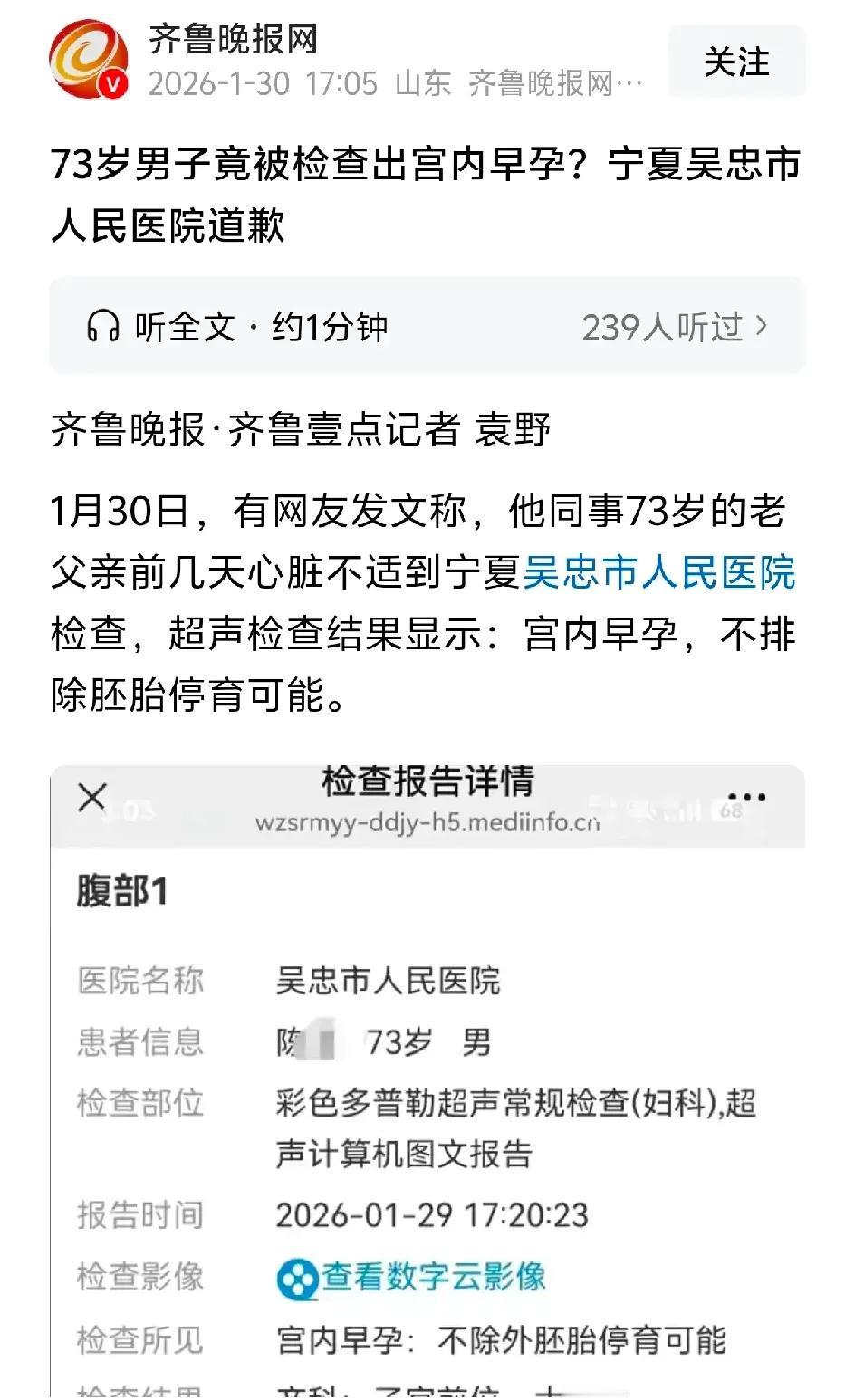 73岁男子竟被检查出宫内早孕?宁夏吴忠市人民医院道歉。宁夏一位73岁的老人,因为心脏不适到医院检查身体的时候,居然查出了宫内早孕胚胎停育可能。 也不知道那些B超检查的医生是怎么操作的?一点都不用心吗?是男科还是妇科都分不清。闹了这么大的笑话,幸好不是小姑娘,如果是小姑娘,误会就更大了。