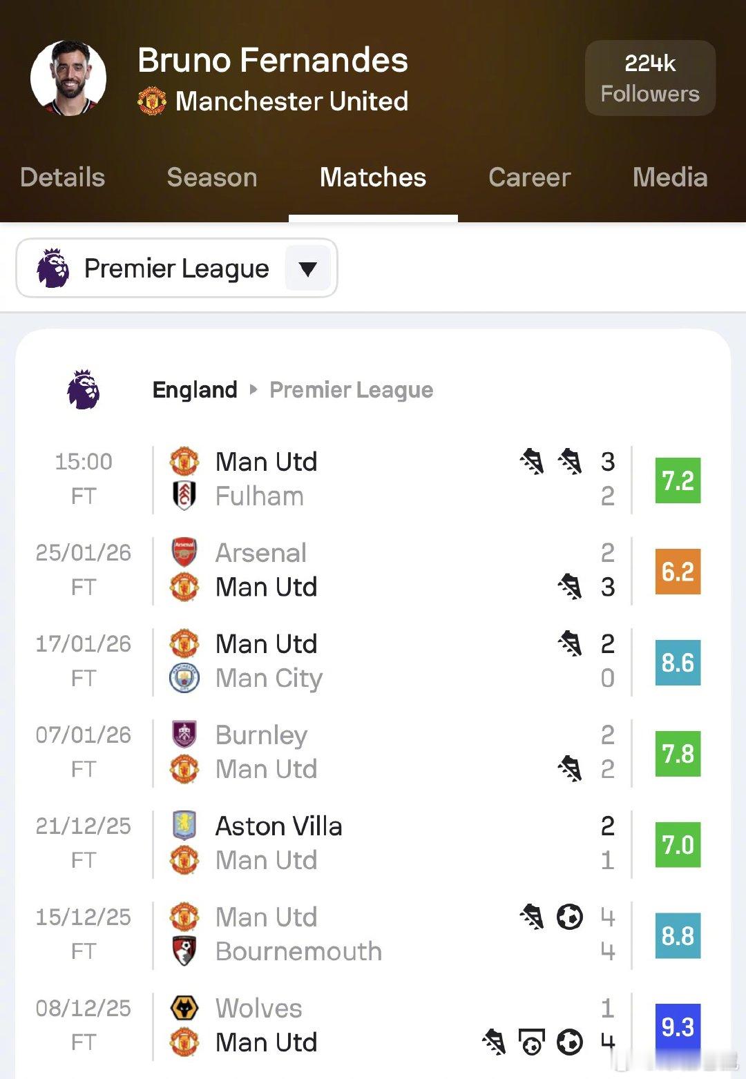 【超级大腿】曼联3比2富勒姆 ,布鲁诺-费尔南德斯送出2次助攻,他在近7场英超送出7次助攻,本赛季英超助攻12次,比第二的谢尔基多出5次!英超