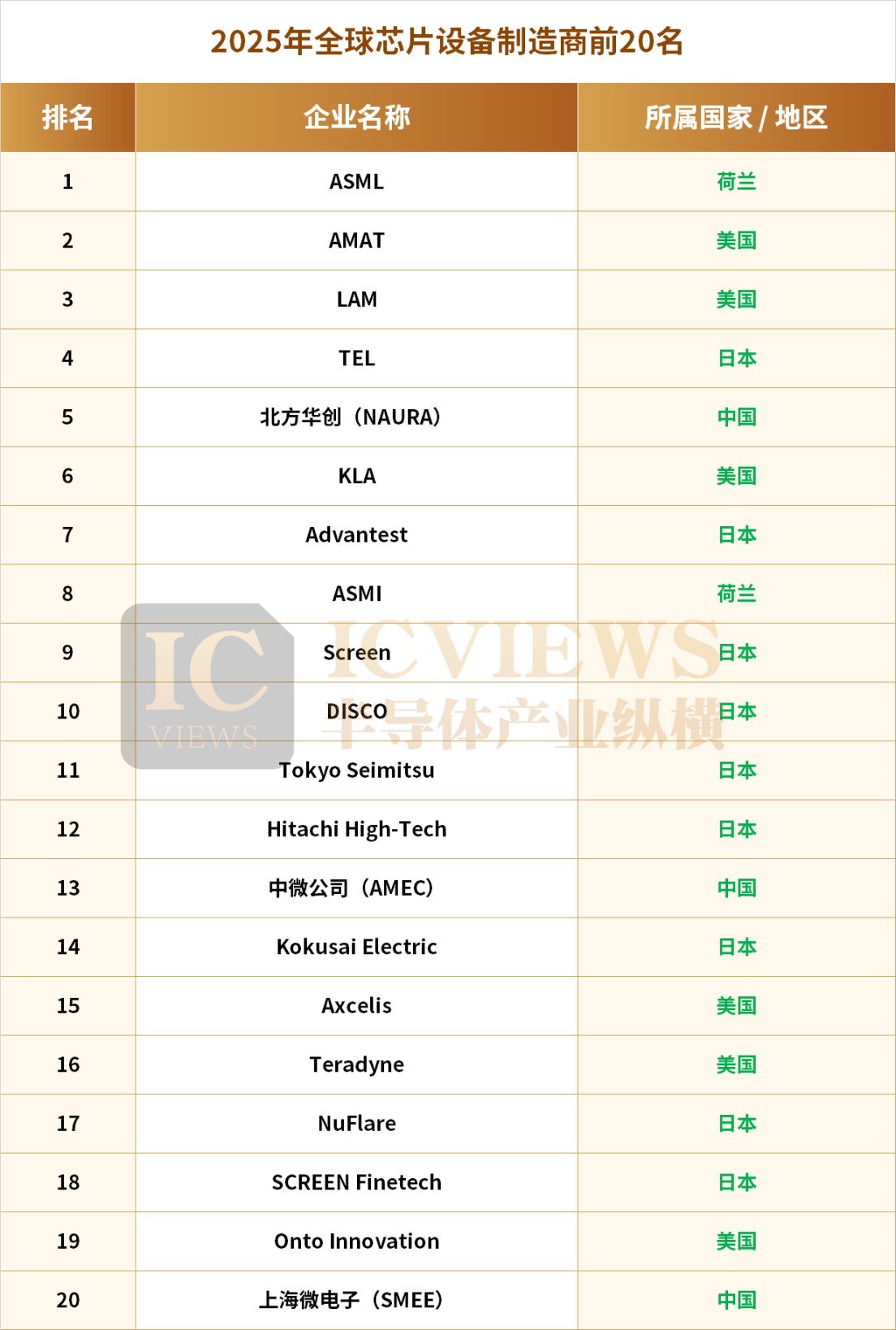 其中,北方华创科技集团股份有限公司从2022年的全球第八位跃升至2025年的第五位,仅次于荷兰阿斯麦(ASML)、美国应用材料(Applied Materials)、美国泛林集团(Lam Research)和日本东京电子(Tokyo Electron),成为中国设备商中排名最高的企业。