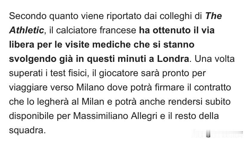 米兰冬季第二签!马特塔!终于搞定了,一波三折啊,好在最后结果是好的,等到现在我已经睡了两觉了,终于刷到了。 菲利普·马特塔正在接受体检,即将从水晶宫转会至AC米兰。两家俱乐部已就这位28岁法国前锋加盟米兰达成协议,转会费将超过3000万欧元。体检结果没有任何问题,米兰与水晶宫俱乐部正在完成最后流程。 为了追赶时间马泰塔将在伦敦接受体检。通过体检,他将正式前往米兰,与 AC米兰正式签约,并立即加入球队。体检已经结束了,从马特塔表情分析体检应当一切顺利,没有意外马特塔已经是一名米兰球员。 最近两年除了莫德里奇最看好的交易就是马特塔了,特别是现在的主教练是阿莱格里,马特塔这样的攻城锤式球员与阿莱格里天然契合,他加盟米兰加上之前的菲尔克鲁格将为米兰下半赛季发力提供帮助。