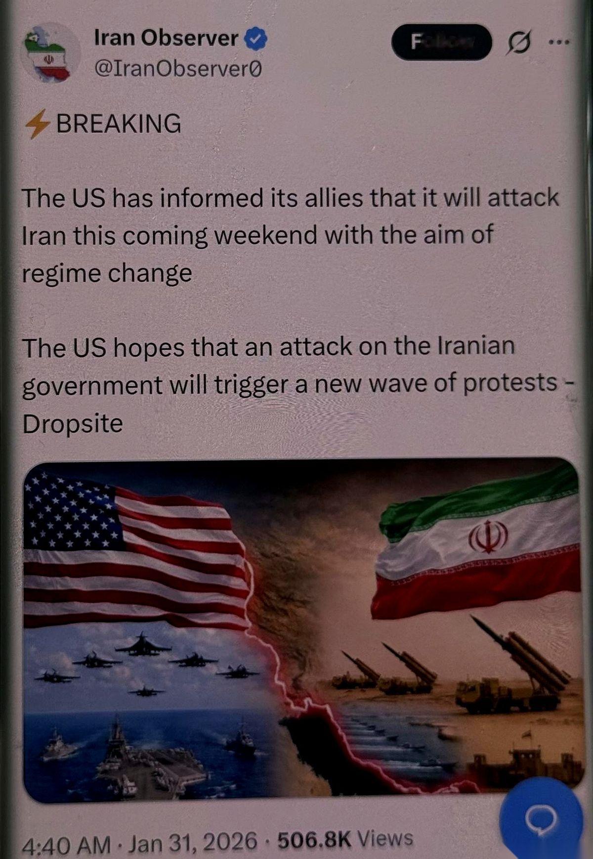 一条消息突然引爆了网络:美国通知盟友,本周末就要对伊朗动手。 目标直接点名——推翻现政权,然后点燃新一轮的抗议。 手机屏幕前的空气瞬间就凝固了。全球的目光“唰”地一下,全都聚焦到了中东。交易员的指尖停在键盘上,能源价格的曲线开始不自觉地跳动。 但等一下。 这消息是从哪来的?顺着网线往回摸,源头不是什么官方发布会,也不是哪个王牌记者的内线。 而是一个自媒体账号。 再往下挖一层,这个账号的消息来源,指向一个叫“Dropsite”的网站。这是个什么地方?不是新闻机构,更像一个匿名的信息聚合点,谁都能往上扔点东西,真假没人核实。 整个链条,就像用一张纸去撬动地球。 一头是足以搅动世界的惊天大新闻。 另一头,却是一个连作者是谁都不知道的帖子。 这就是21世纪的战争迷雾,一条没有出处的传闻,就能让全世界的神经跟着紧绷几小时。所以说,有时候最响的警报,不是炮弹的声音,而是手机推送过来的那一句话。