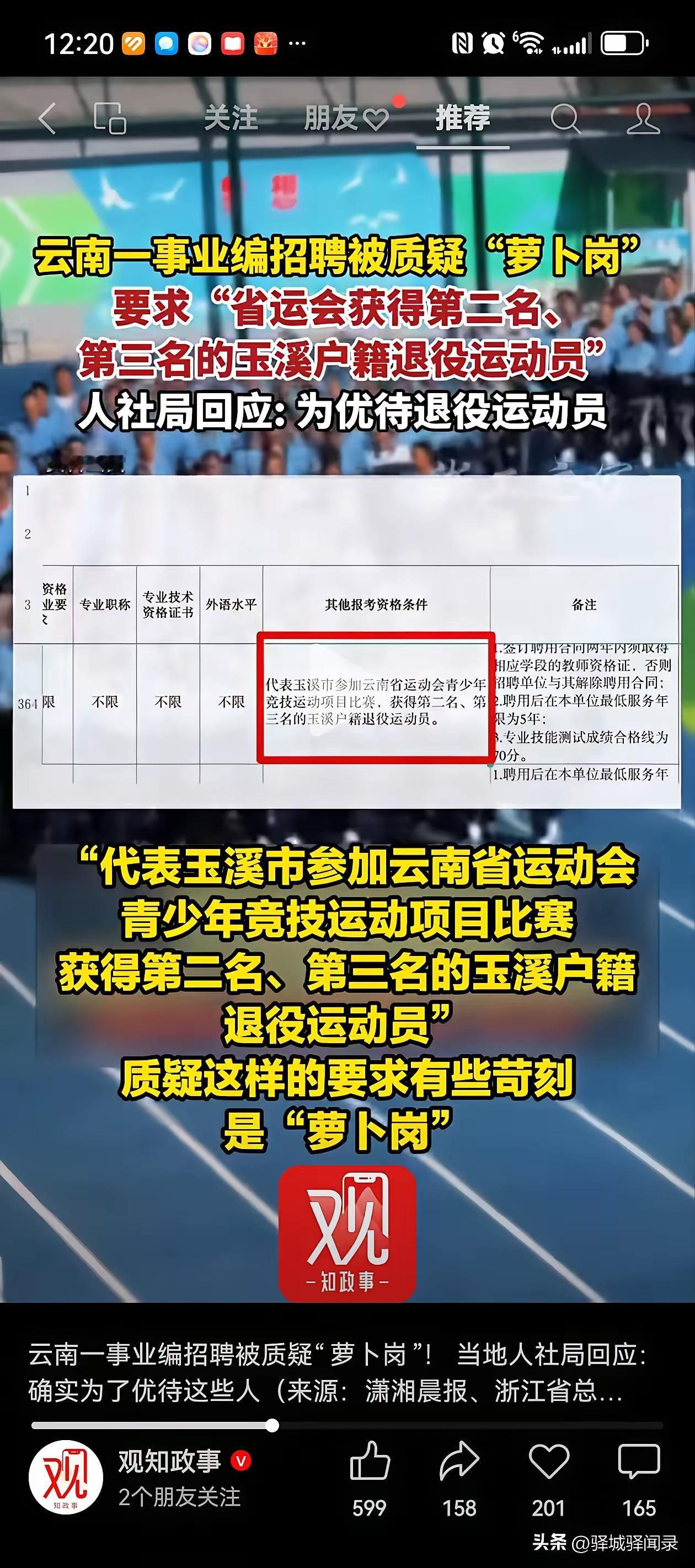 —这叫萝卜岗?—云南玉溪,一事业编招聘要求“省运会获得二三名的玉溪籍退役运动员。虽然就差报身份证号,但是个人觉得合理,至少 不是给七大姑八大姨,无能力的人安排,是给拿过奖的运动员,当体育老师绰绰有余。 为国家做出贡献的家应该被优待,直接光明正大的发文就行了。