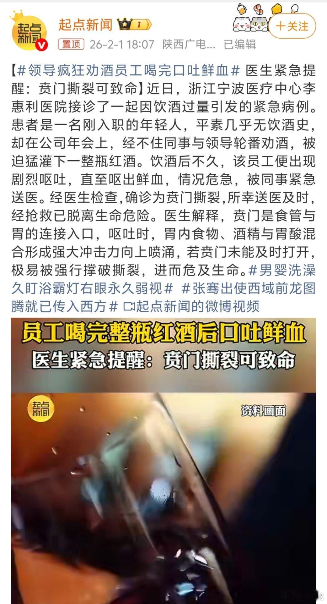 领导疯狂劝酒员工喝完口吐鲜血 哎,作为一个过来人,我明确告诉你们,公司的酒局是必不可少的,应酬或者跟同事们开心等等。喝可以,千万不能过量,尤其是本质上自己还不能喝的人,如果领导让你喝酒,你就一句话告诉他不能喝,喝不了,喝了可能会出事。这哥们估计以后要得反流性食管炎了。