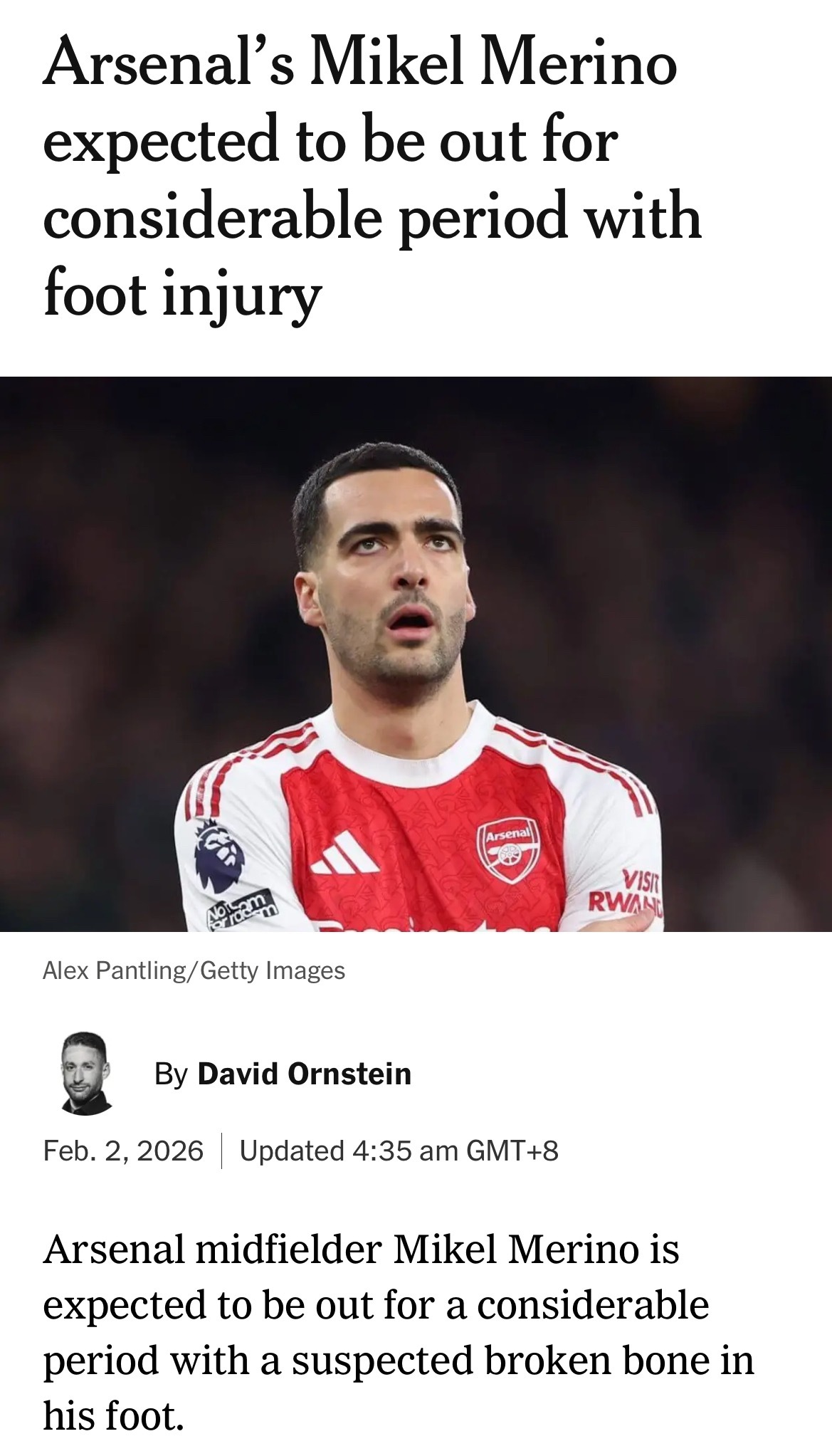 David Ornstein:梅里诺因疑似脚部骨折,预计将缺席相当长一段时间。俱乐部在周日晚间确认,梅里诺将在未来几天内就此问题进行手术。阿森纳正在市场上寻找潜在的短期租借人选作为替补,但在现阶段无法保证有任何实质性进展。随着评估的继续,梅里诺回归的具体时间表仍不明确。