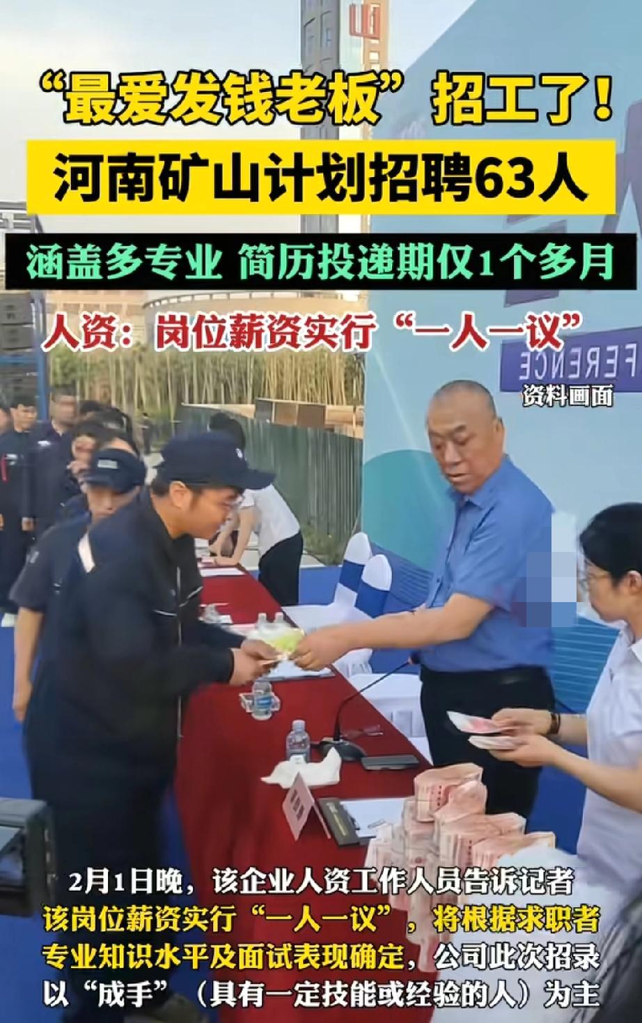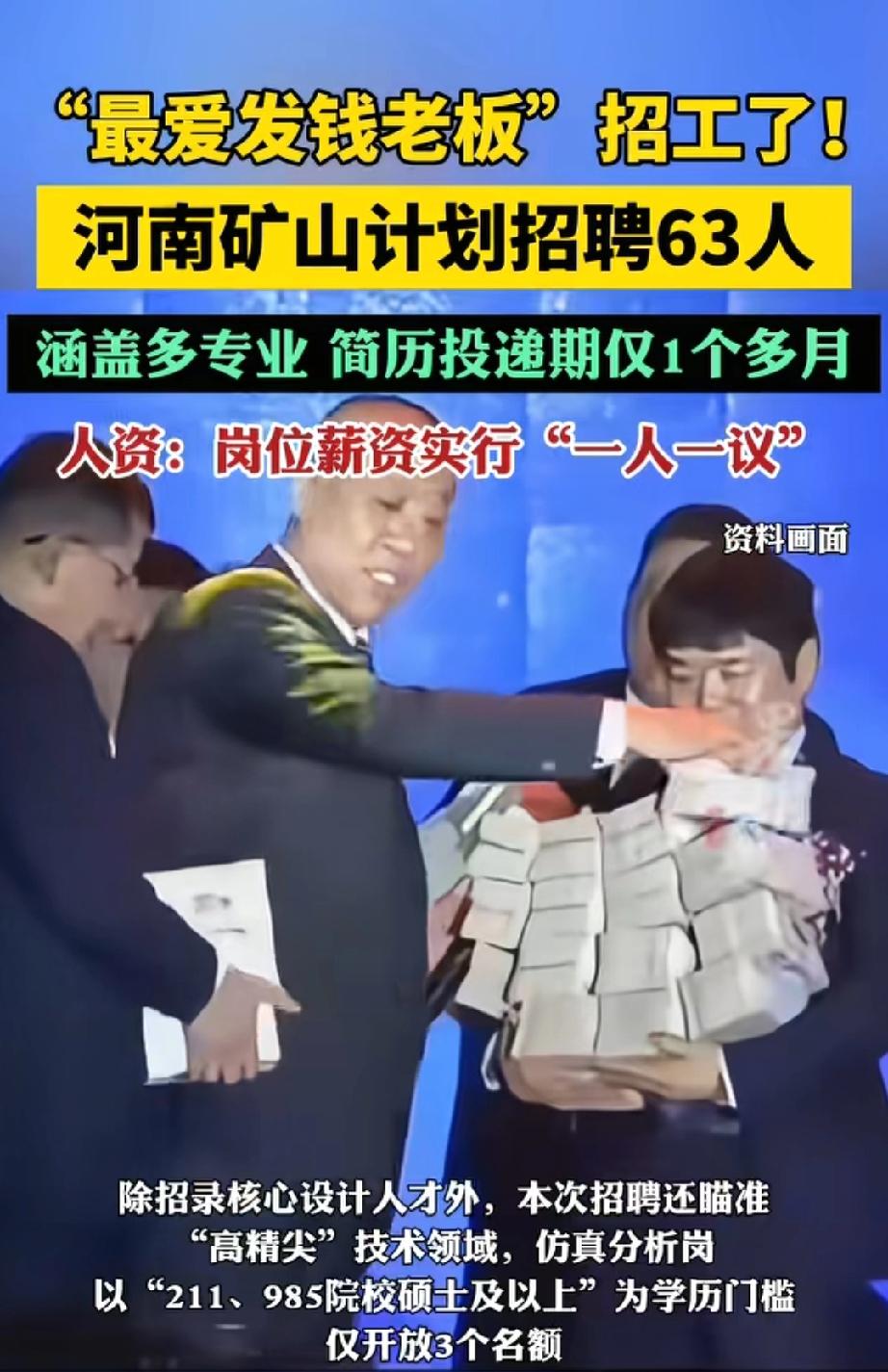 “再搁上2000万!”那个最爱发钱的河南矿山老板,能不能三二一上链接,让全国的打工人沾沾光! 之前直接给员工发成捆现金,现在又放出63个岗位,还喊着“一人一议”开高薪,这泼天的富贵真让人眼馋! 这年头,能遇到把“发钱”当企业文化的老板,比遇到靠谱对象还难,回去整理下简历,先投为敬! 河南矿山集团 河南矿上老板