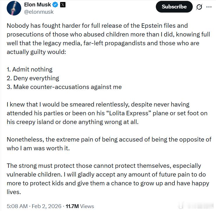 马斯克就“爱泼斯坦文件”发文:在推动全面公开爱泼斯坦档案、并起诉那些虐待儿童的人