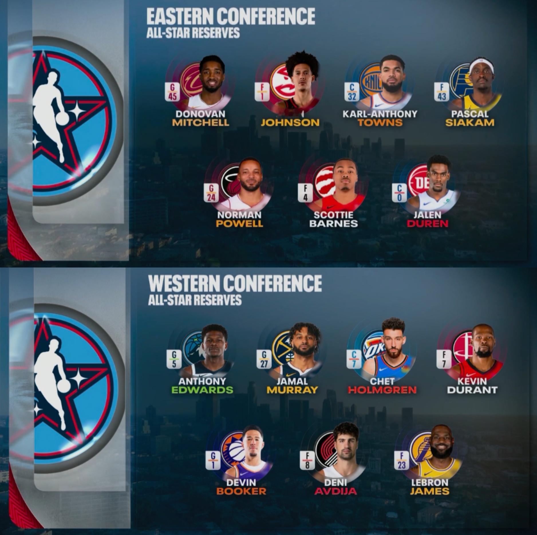 东部全明星替补:多诺万-米切尔、杰伦-约翰逊、卡尔-安东尼-唐斯、帕斯卡尔-西亚卡姆、诺曼-鲍威尔、斯科蒂-巴恩斯、杰伦-杜伦