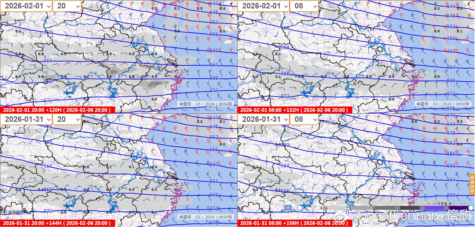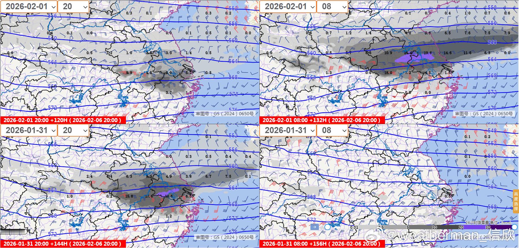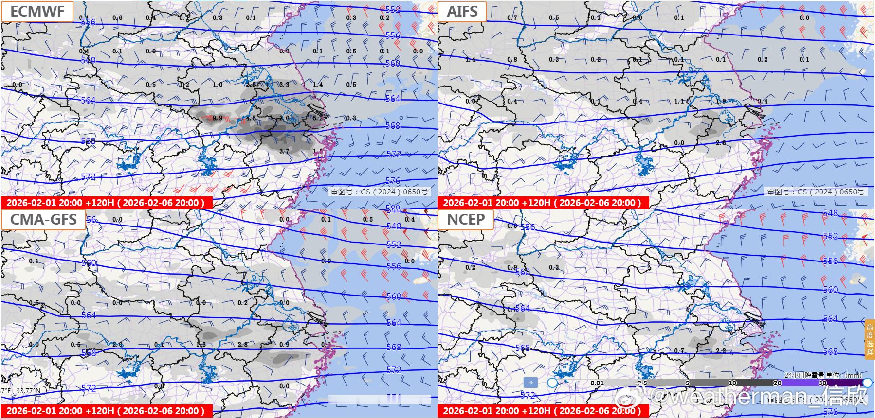 图4为欧洲报最近4个起报时次给出的,均为2月5日20时-6日20时的降雪量预报,可见2月1日8时预报的低空偏南暖湿气流极强,因此给出的降雪量很大。但2月1日20时预报,调弱了偏南暖湿气流,因此降雪调弱。而图5和图6为我国和美国报,我国报略向北调增,美国报总体给出雪较少。后期继续根据冷暖气流强度变化,临近确认。