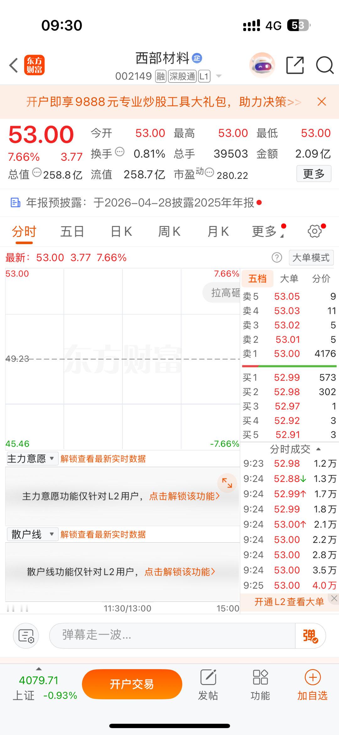 上周五分享的西部材料002149今天高开,今天注意不涨停可能会跑,盈利了大家自行