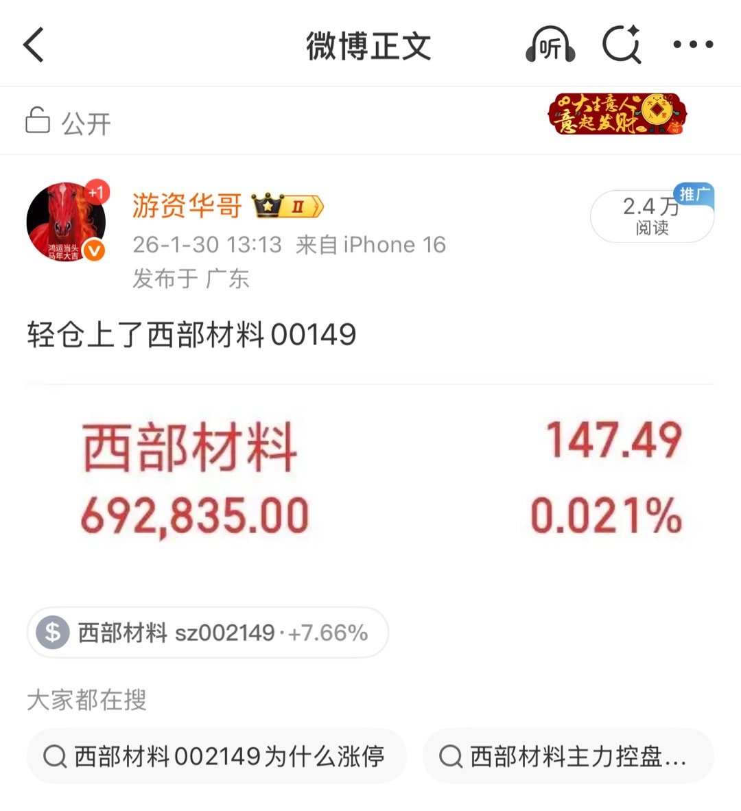 上周五分享的西部材料002149今天高开,今天注意不涨停可能会跑,盈利了大家自行把握,激进的可以博弈