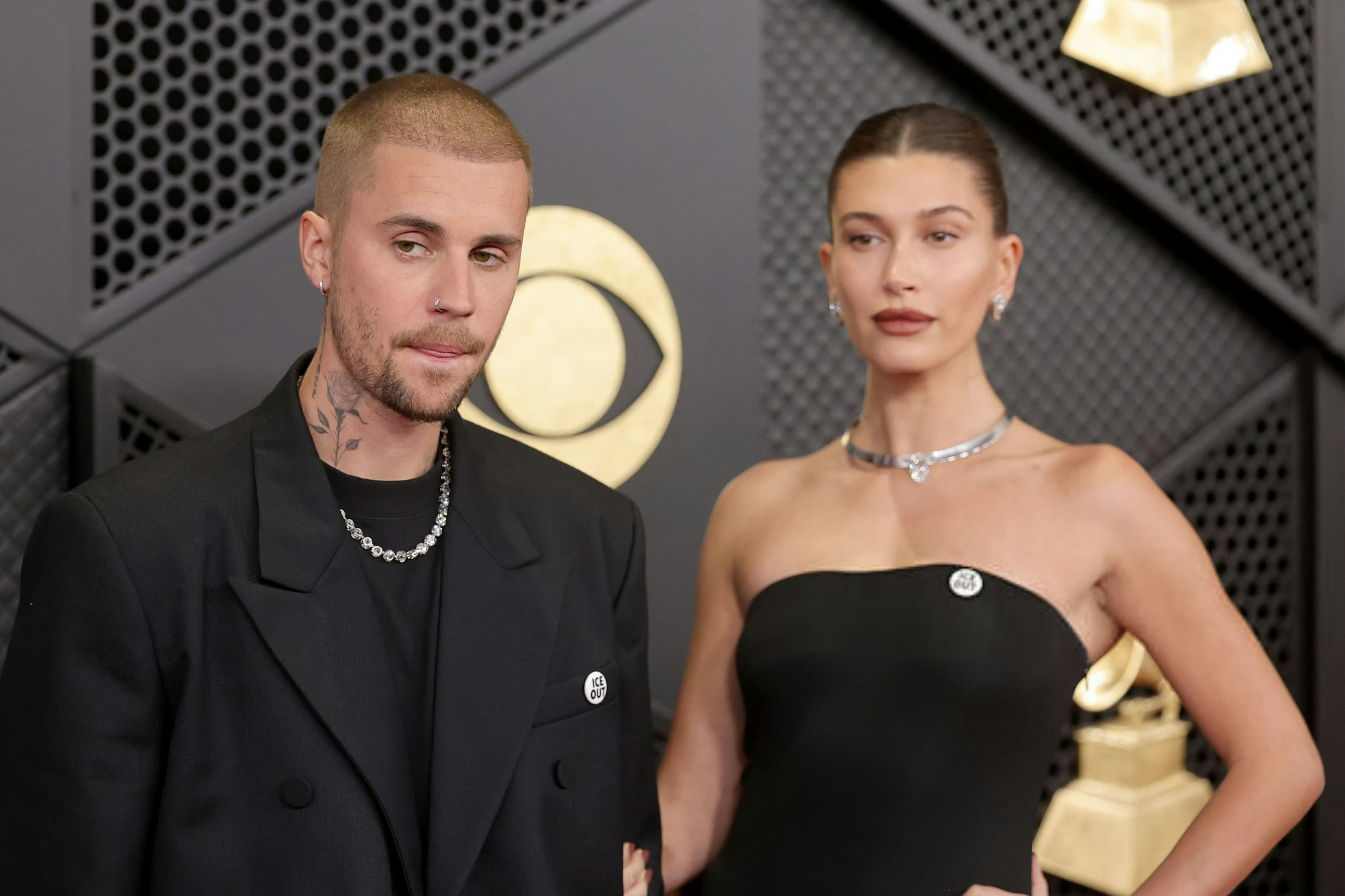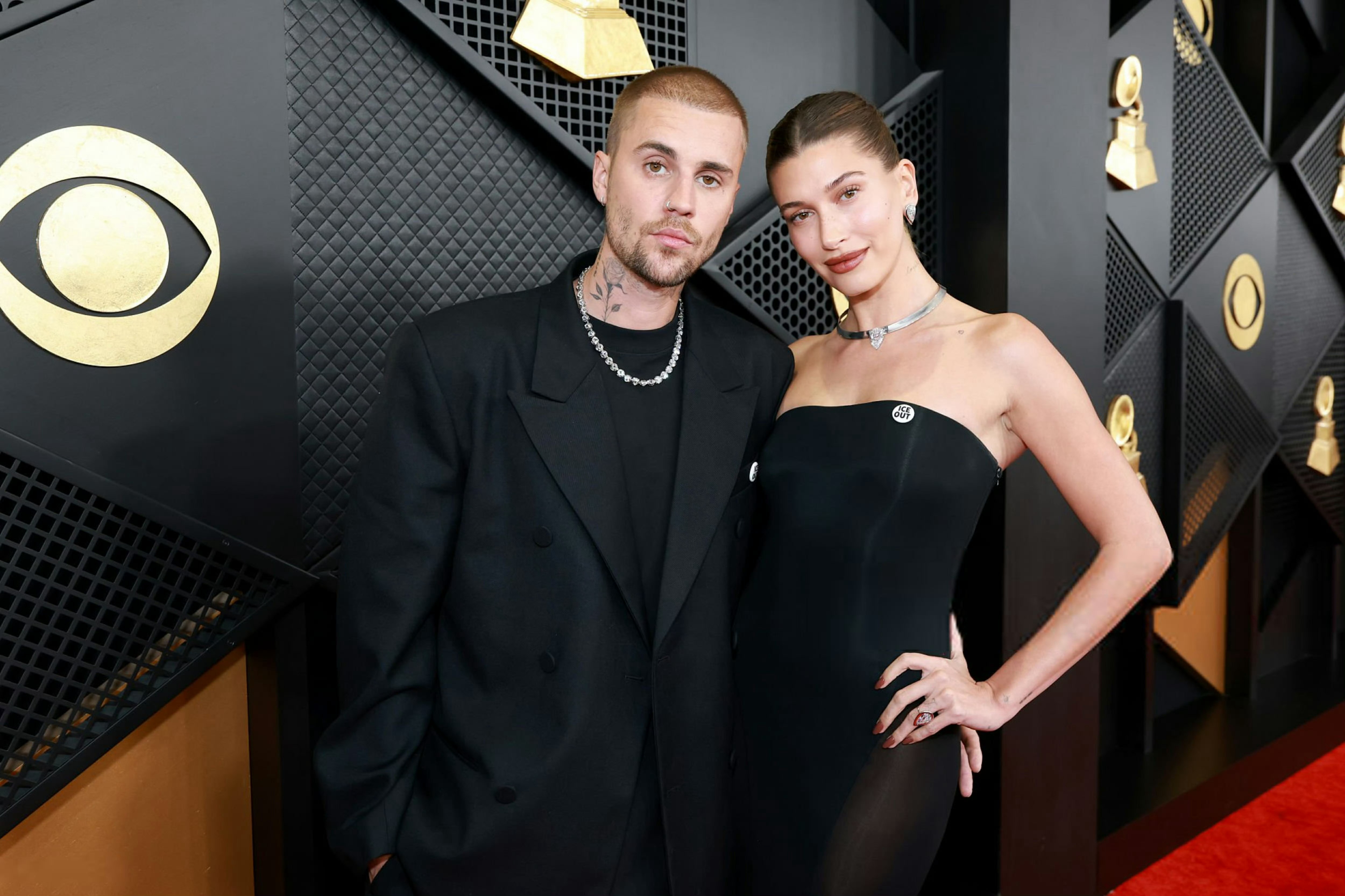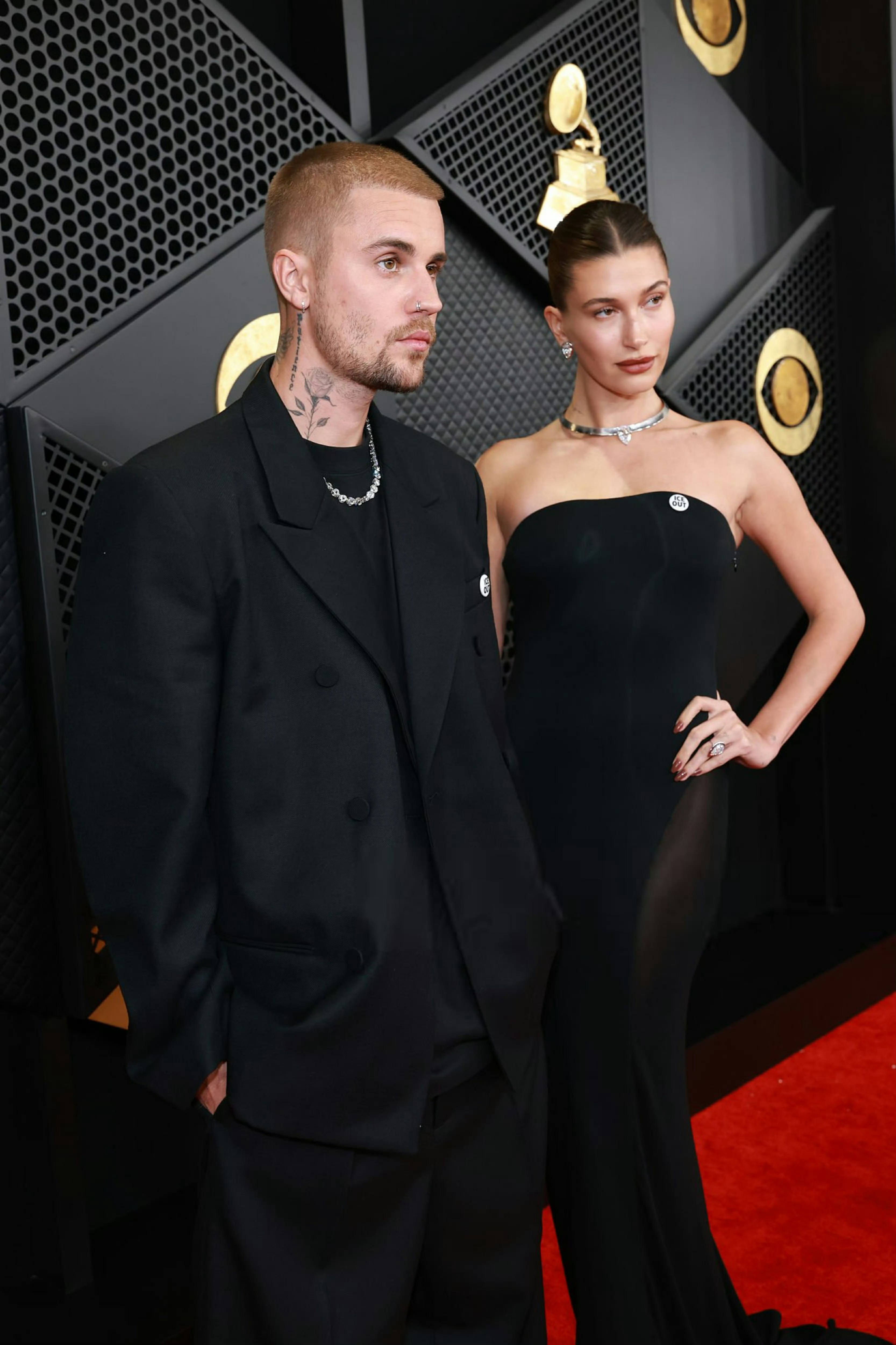 出席第68届格莱美奖红毯的贾斯汀.比伯和爱妻海莉。比伯身穿Balenciaga西服套装,海莉身穿的是Alaïa 黑色礼服。米拉服饰解析 格莱美直播