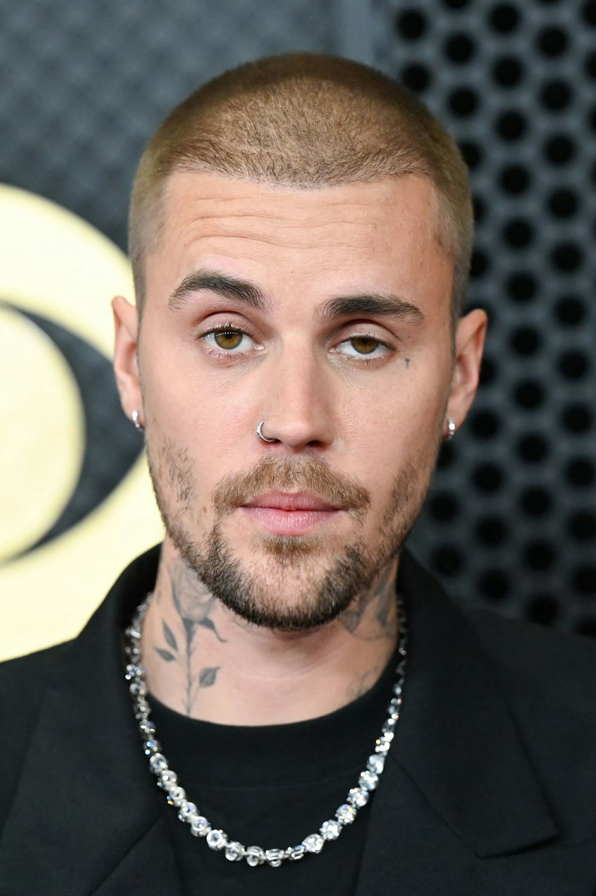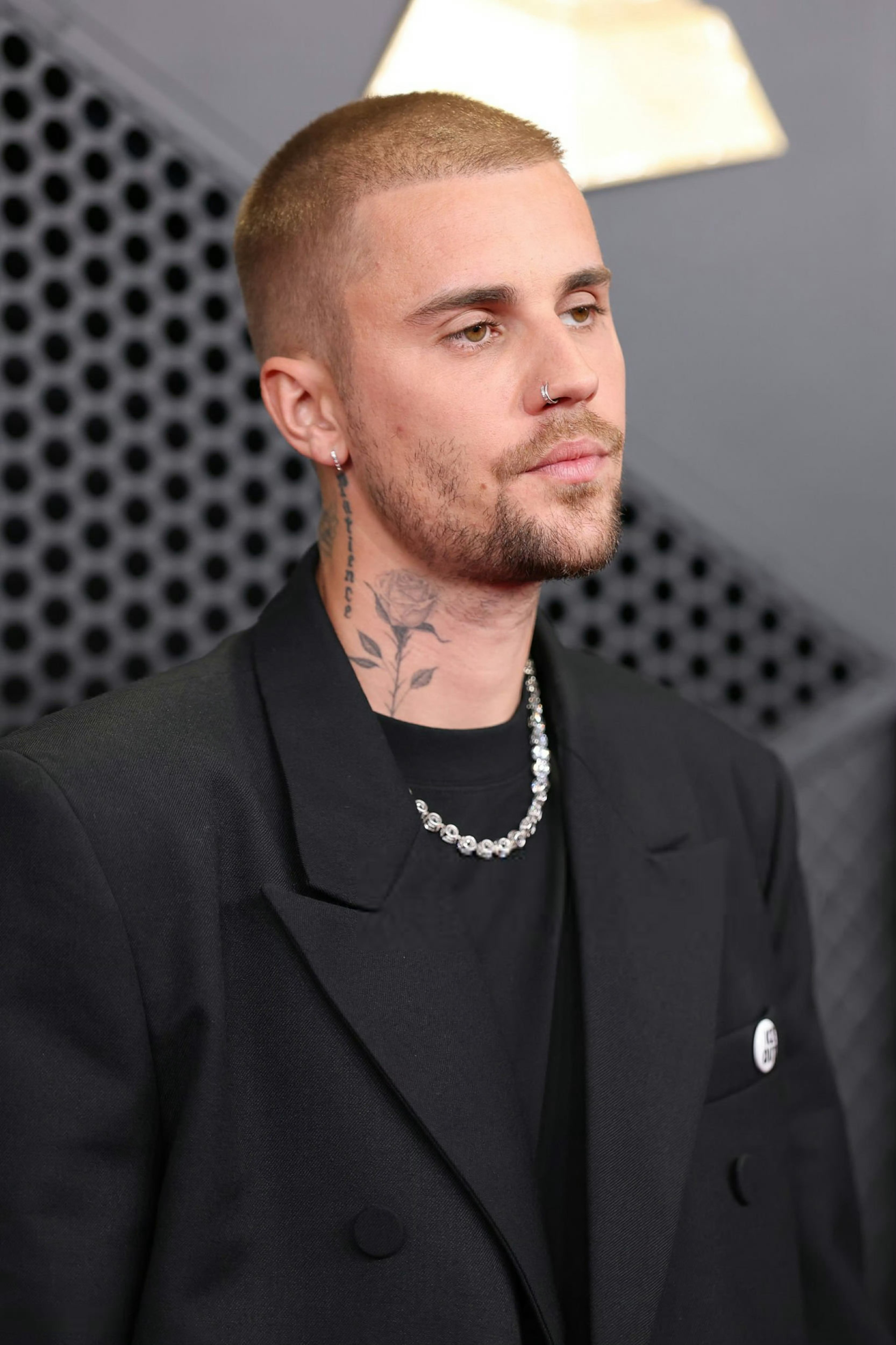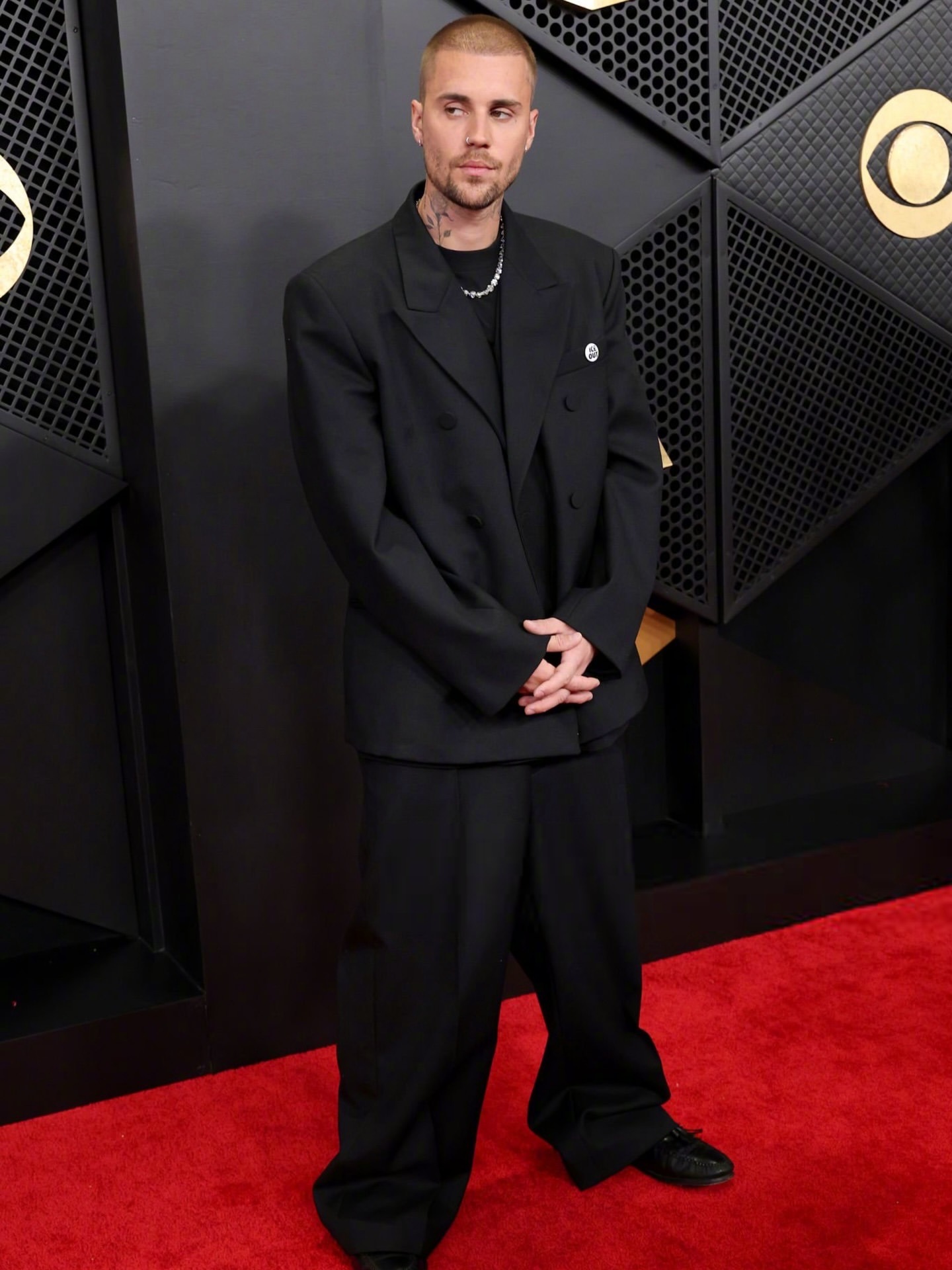 出席第68届格莱美奖红毯的贾斯汀.比伯和爱妻海莉。比伯身穿Balenciaga西服套装,海莉身穿的是Alaïa 黑色礼服。米拉服饰解析 格莱美直播
