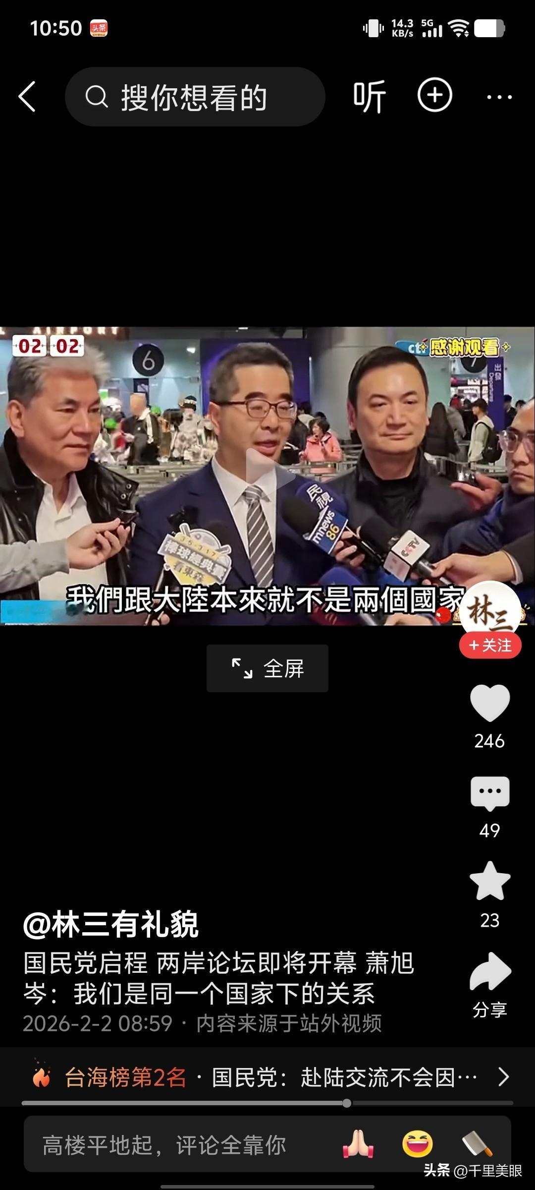 国民党副主席萧旭岑带队前往中国大陆“国共两岸论坛”,接受媒体采访公开表示:“两岸同属一个国家体系,但两岸的政治分歧还没有得到解决。” 这话说出了两岸客观事实情况,没有回避问题,进一步来往深处来说其实就是“一国两制”。 “一国两制”从国民党副主席口中说出,说明以郑丽文为首国民党党中央是认可一国两制的,但国民党内部杂音比较多,不能全党一心。 另一方面国民党在台湾的基本盘只有30%支持率,还有70%民众不认可国民党,国民党要获得更多民意支持才能有所作为。 因此要通过和平手段解决两岸统一,路还遥远。除非采用武力兼顾手段才能加速统一进程。