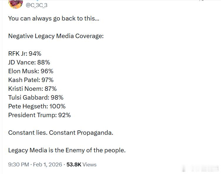 小肯尼迪:94%JD·万斯:88%埃隆·马斯克:96%卡什·帕特尔:97%克里斯蒂·诺姆:87%图尔西·加巴德:98%皮特·海格塞斯:100%特朗普总统:92%
