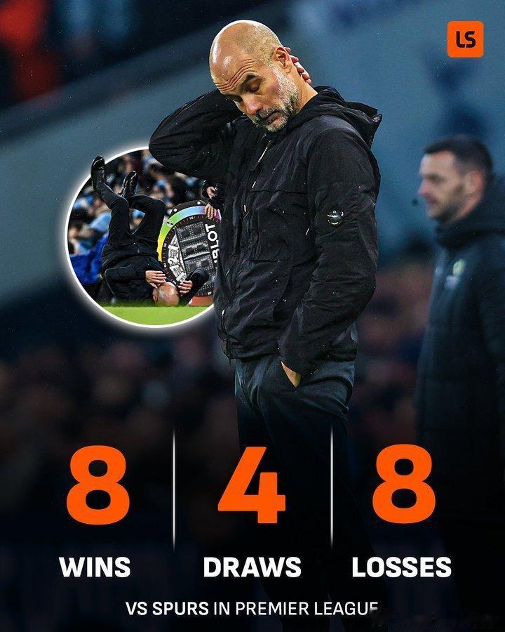 瓜迪奥拉带领曼城在英超和热刺对垒20场,8胜4平8负,战绩平分秋色。热刺遇到瓜迪奥拉的曼城,一共打入30个进球,是瓜帅在联赛中丢球的最多的对手。 不得不说,足球场上就是有这种克星啊,热刺其实是瓜迪奥拉命中注定的拦路虎。