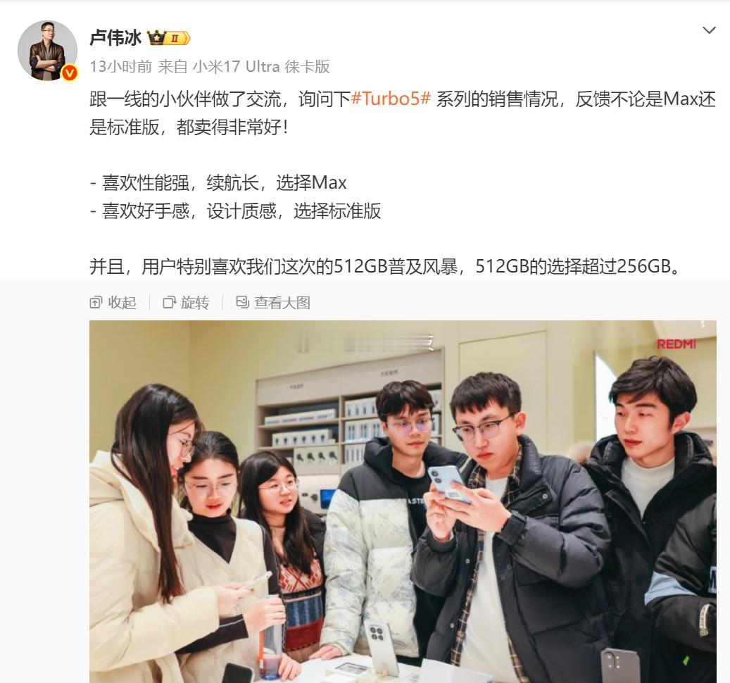 卢伟冰透露,REDMI Turbo5系列销量非常好